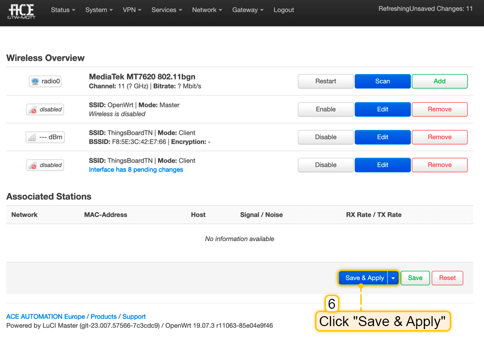 - Go to Gateway > MQTT Configuration > ETHERNET STATIONS LIST (under MQTT Broker section);