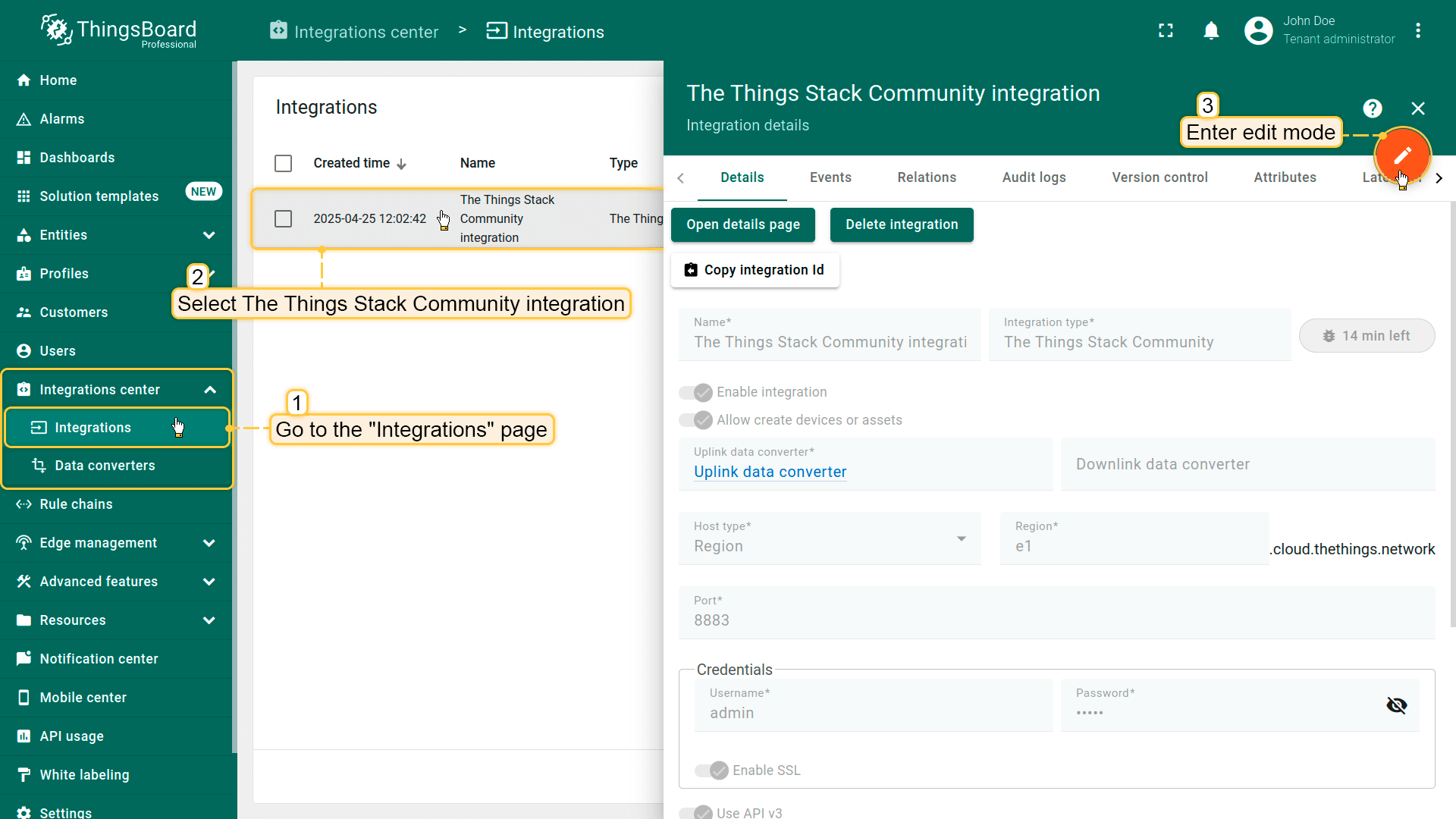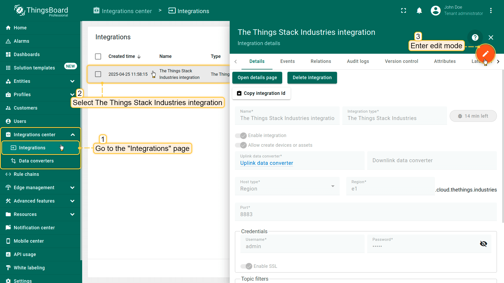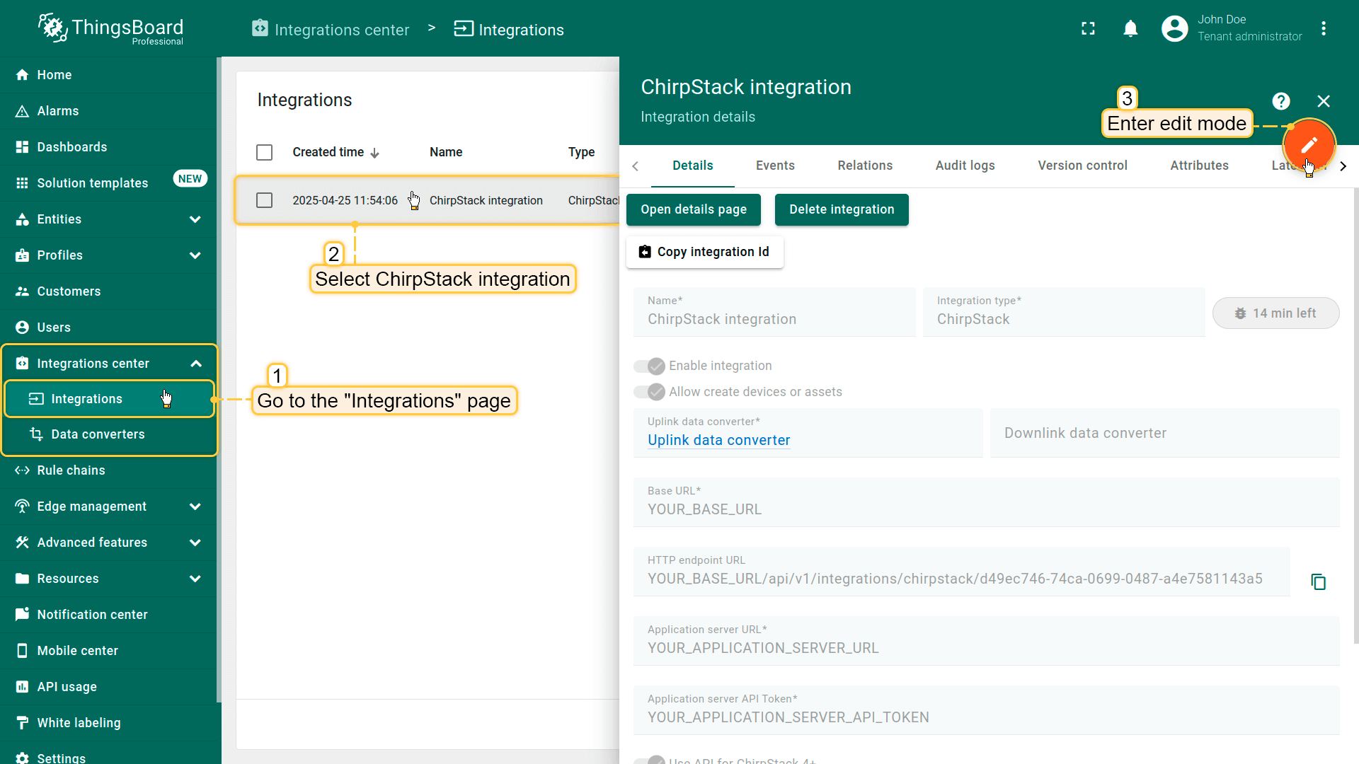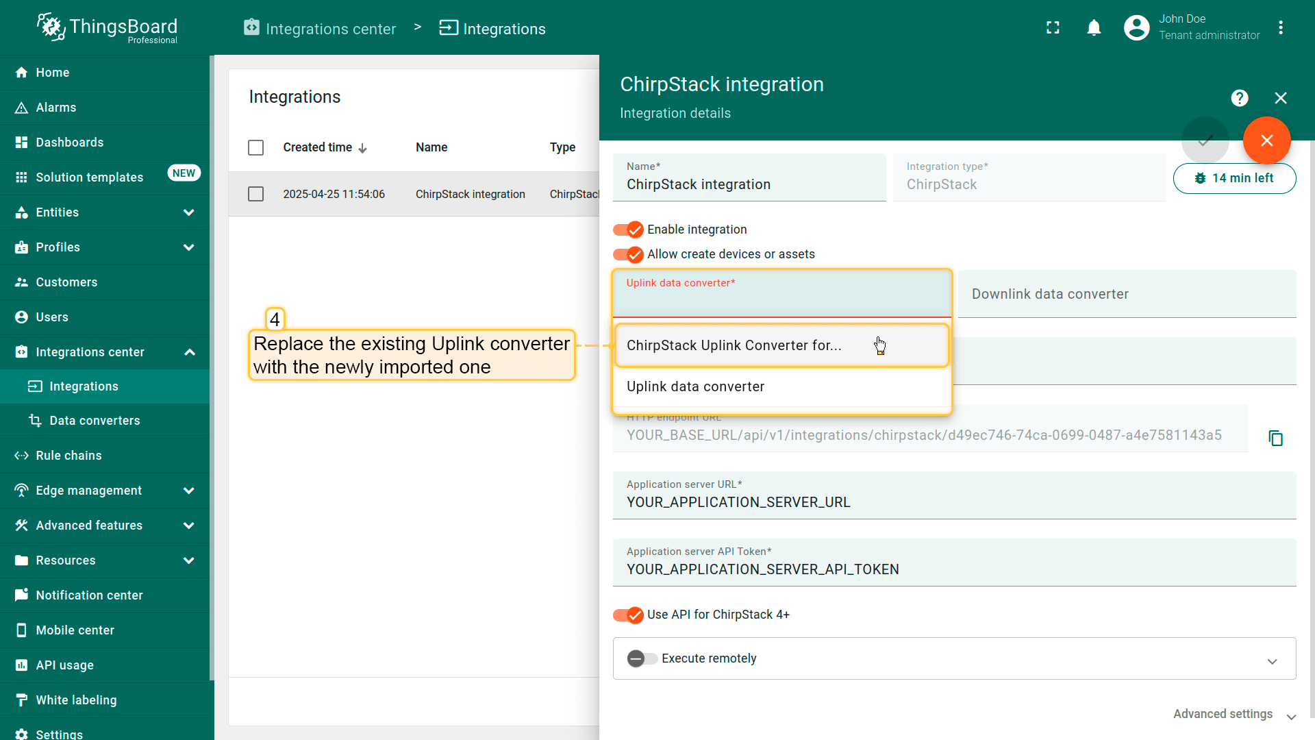 Go to the “Integrations” page in the “Integration center” section. Click on your ChirpStack integration to open its details window. Enter edit mode by clicking the orange pencil button in the top-right corner. Replace the existing uplink converter with the imported one. Don't forget to save your changes! |