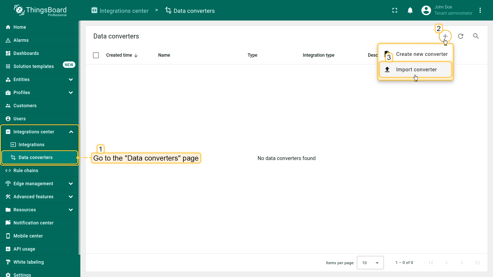 Navigate to the “Data converters” page in the “Integration center” section. Click the “+” icon in the top-right corner of the page and select “Import converter” from the drop-down menu. Drag and drop the downloaded JSON file (containing the uplink converter configuration) into the import window, then click “Import”. The uplink converter is now successfully imported.