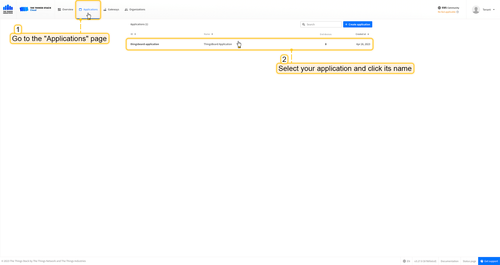 Login to the cloud and open your console. Go to the Applications page. Then select your application and click on its name. Click on the Register end device button. Put the APP EUI value to the JoinEUI field. Press the Confirm button. Fill the rest parameters and press Register end device button. Uplink converter in IoT Hub integrationStep 1: Download the JSON file Download the JSON file with the uplink converter settings by clicking the button below. Download uplink converter for The Things Stack integration.