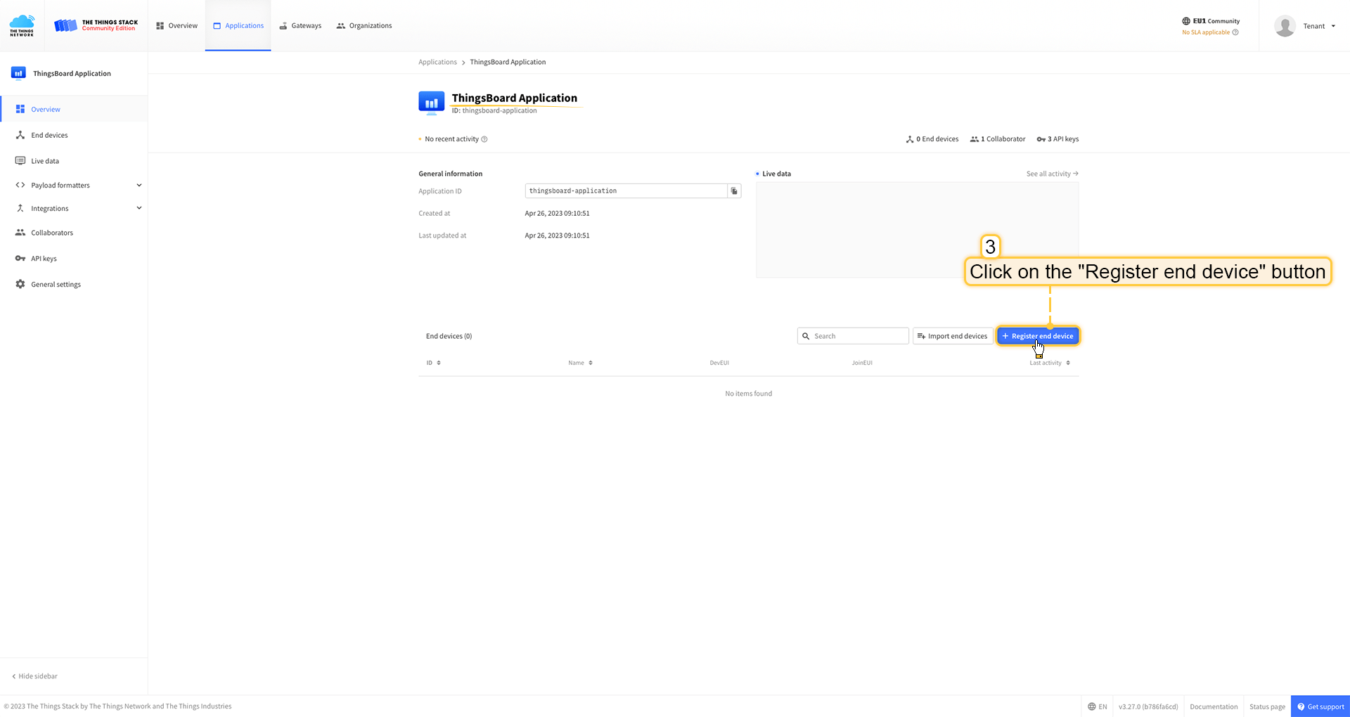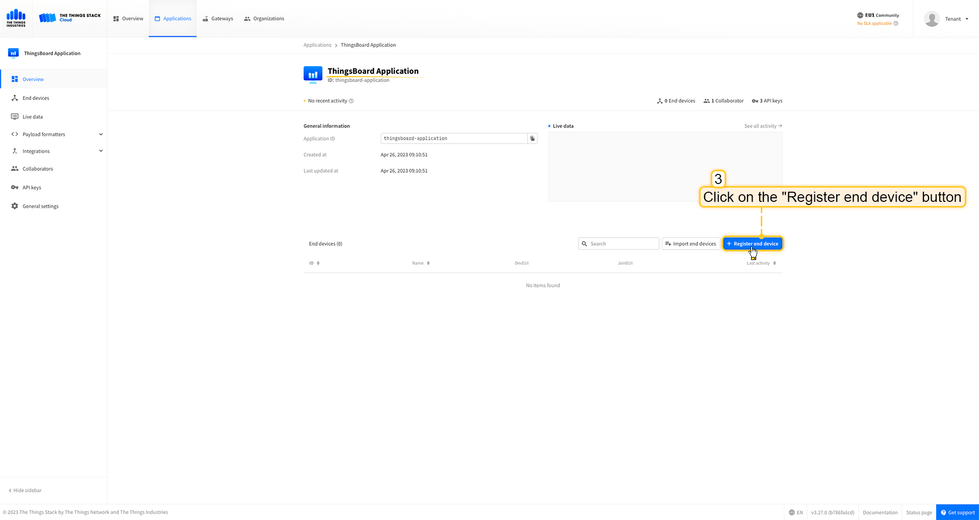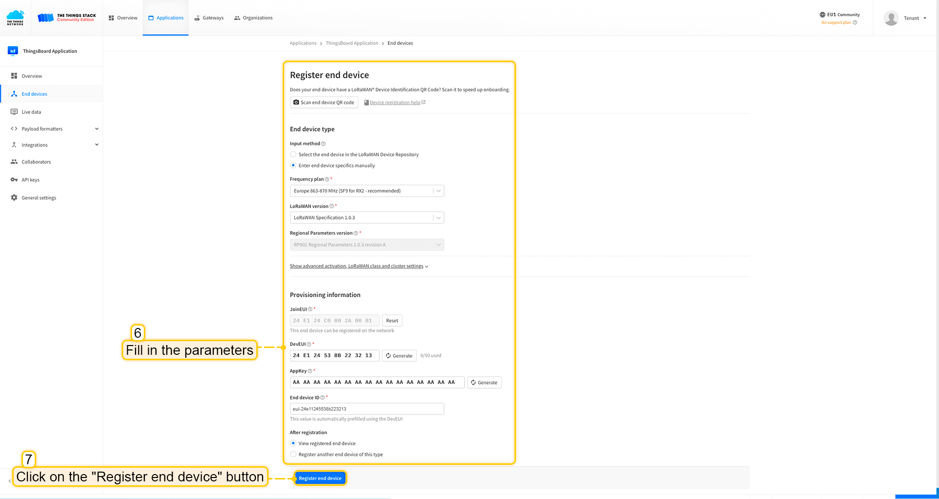 Add a device on The Things Stack Community EditionWe need to add a device on The Things Stack Community Edition. To add a device, you can follow next steps: