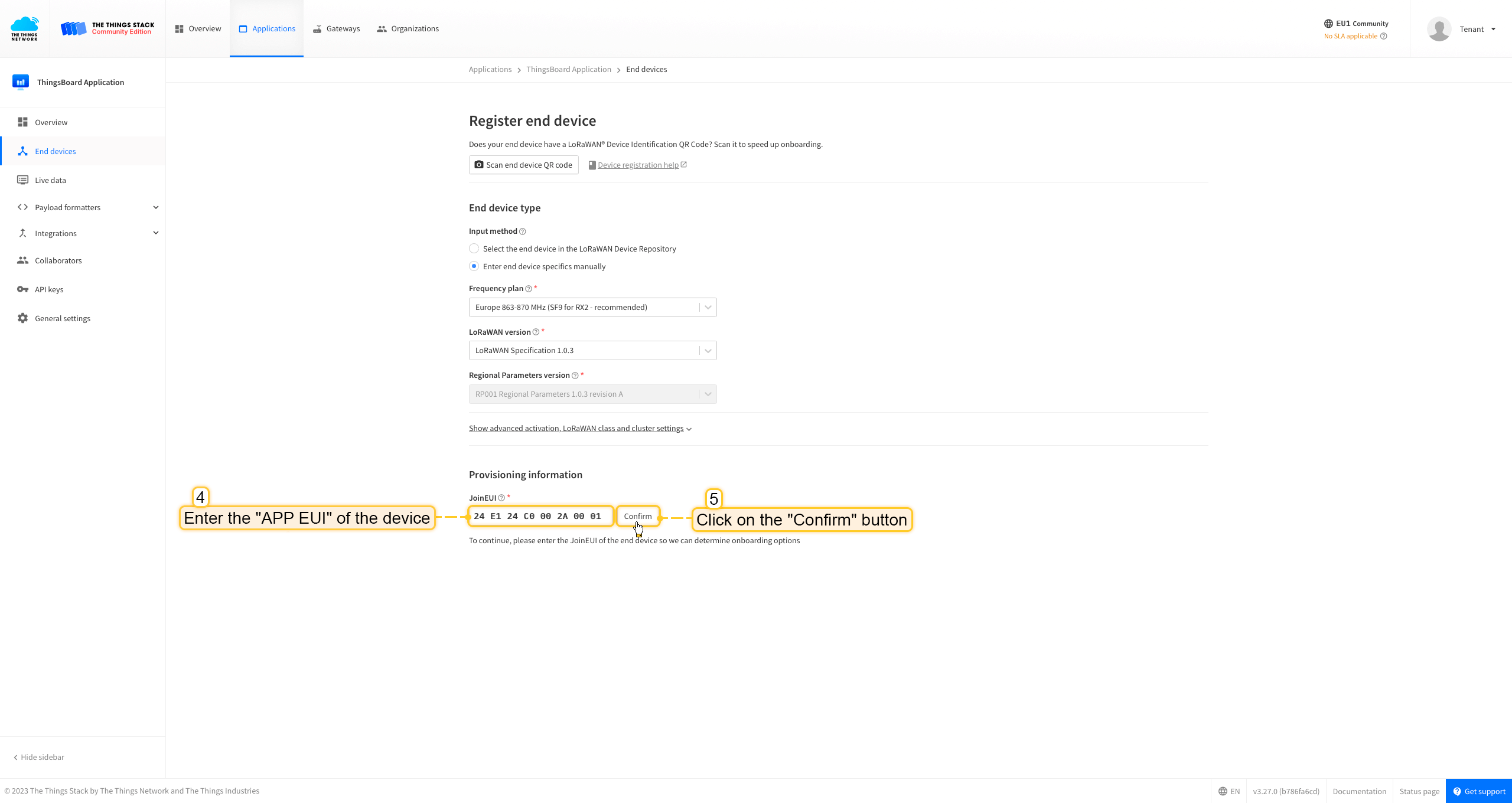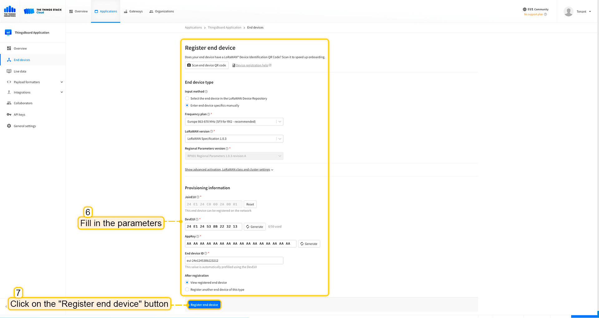 Add a device on The Things IndustriesWe need to add a device on The Things Industries cloud. To add a device, you can follow next steps: