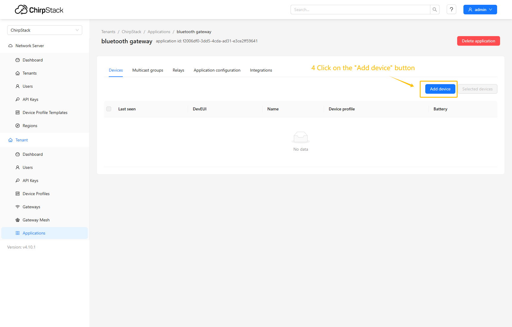 Enter the device Access token (previously copied Device EUI value) and click the Add button.