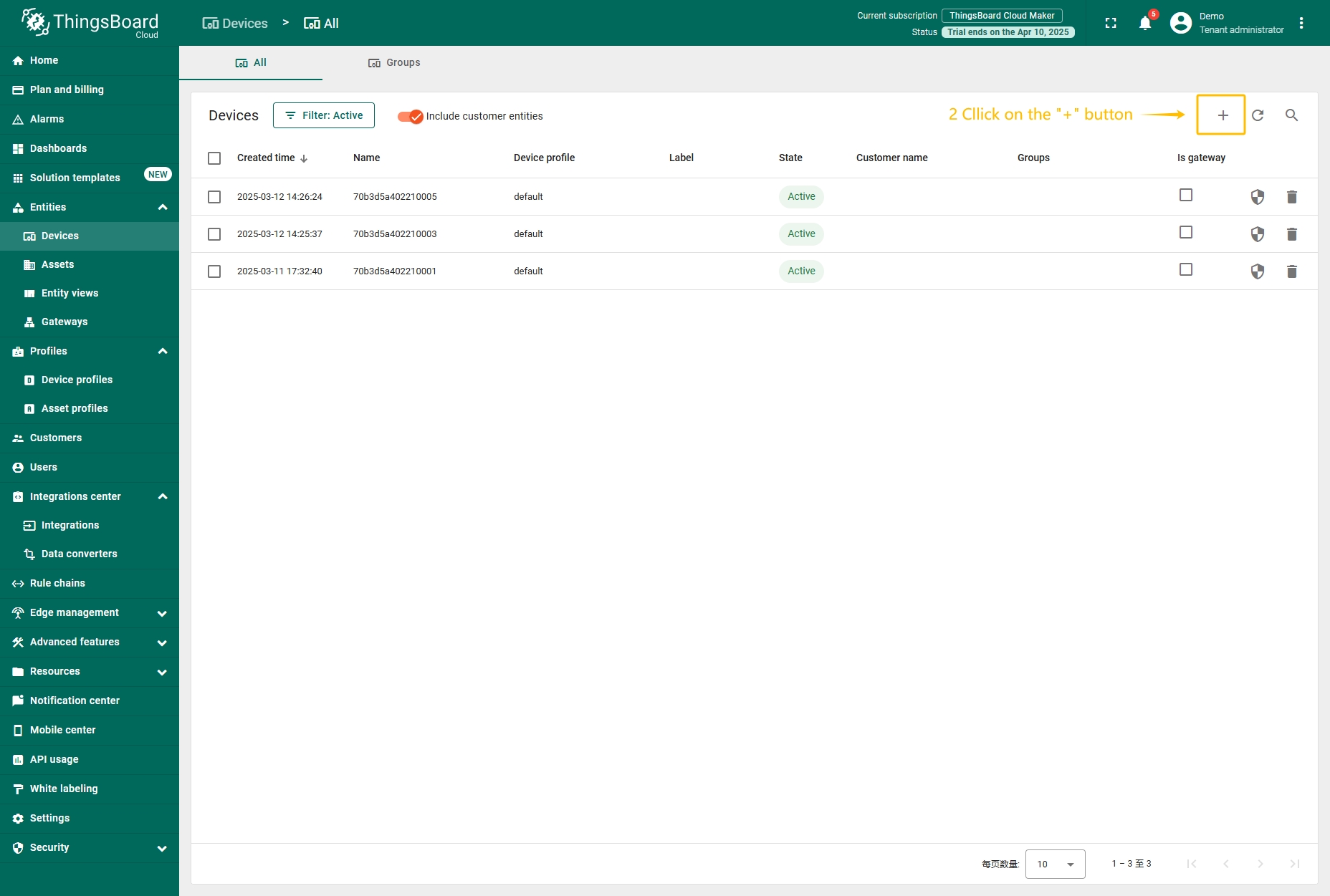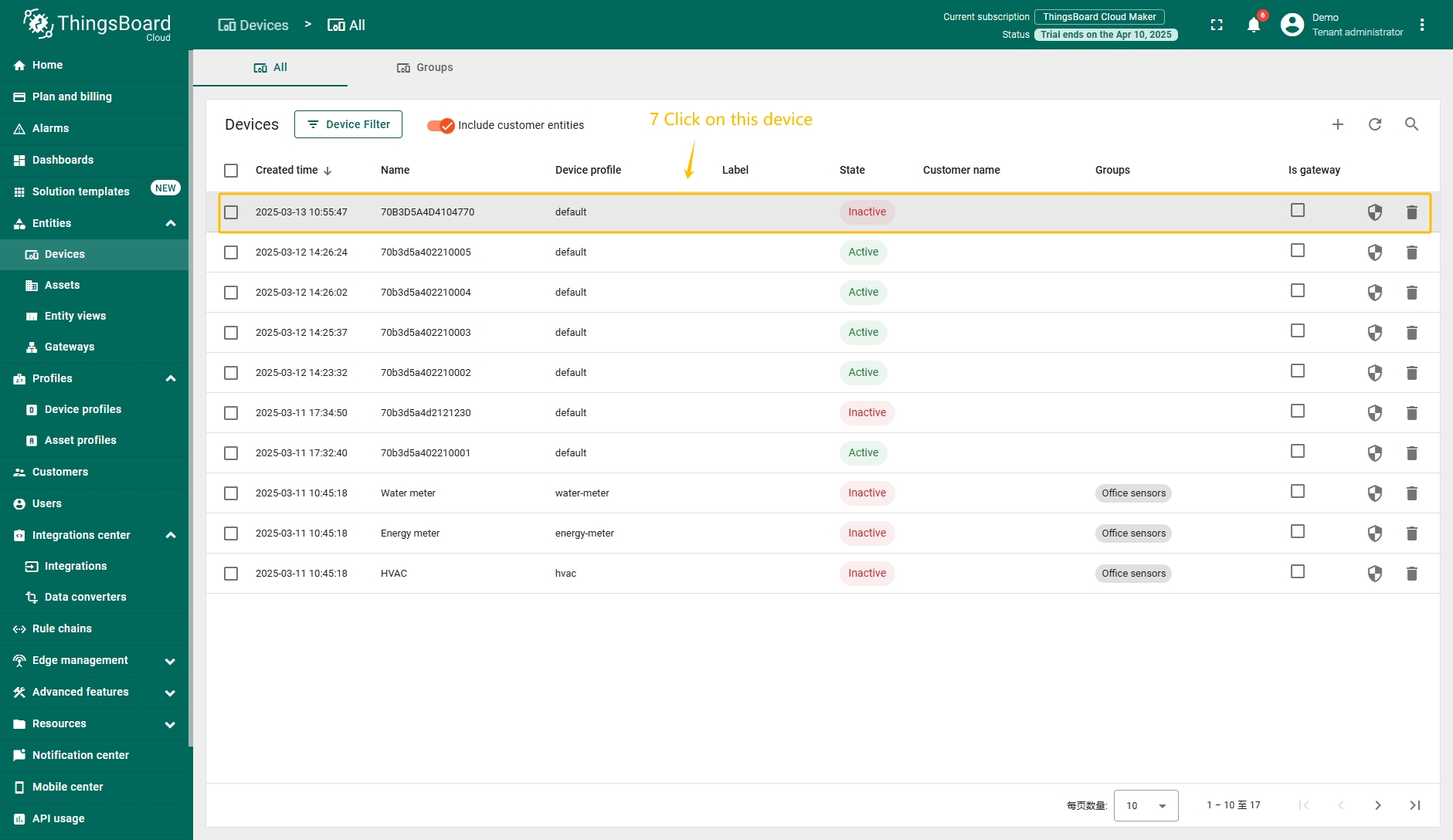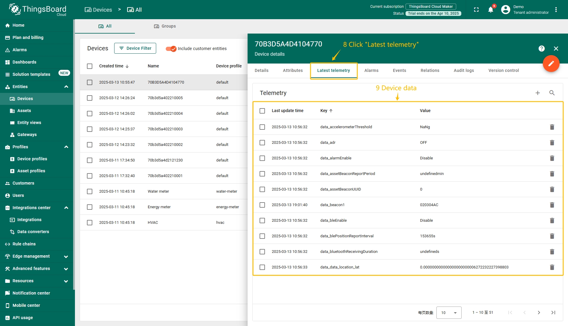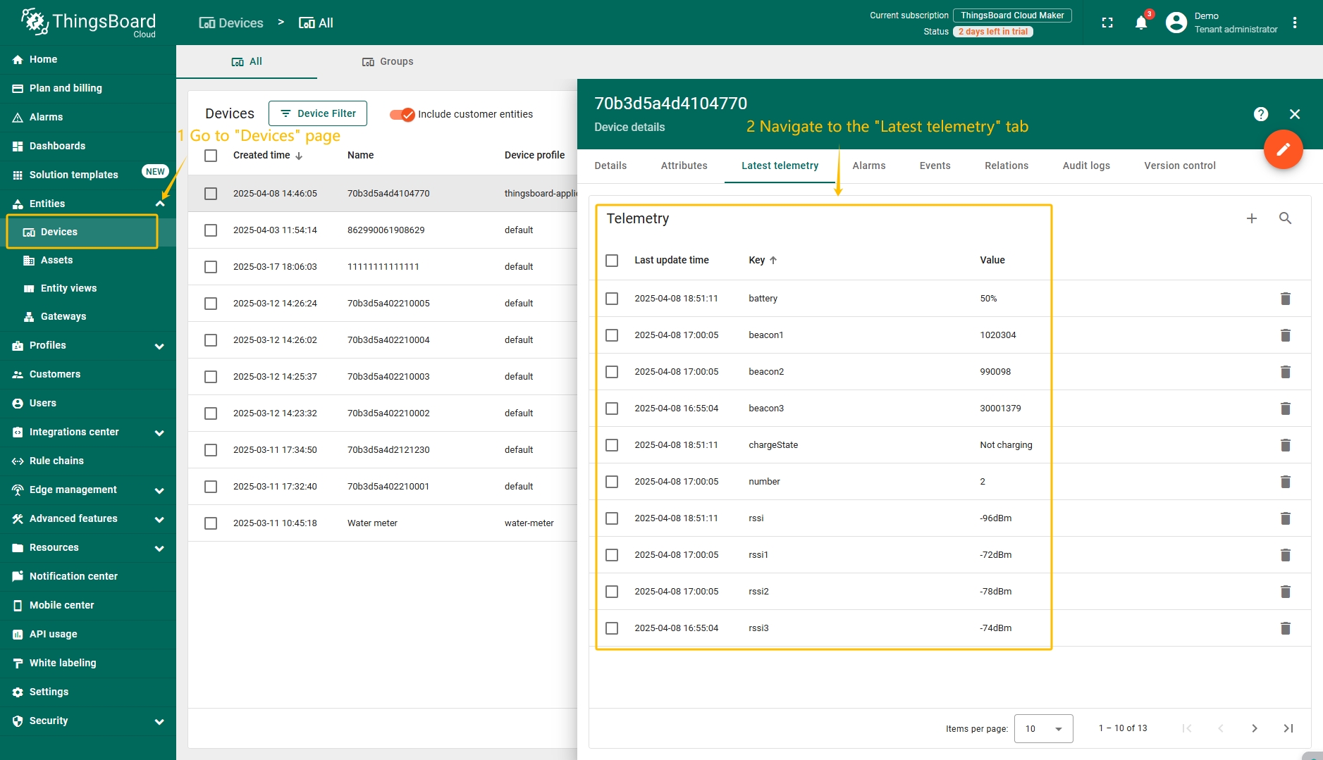 To check it you may open Devices page in Entities section. The device should be in devices list. You can check the data by click on it and open tab Attributes or Latest telemetry .
