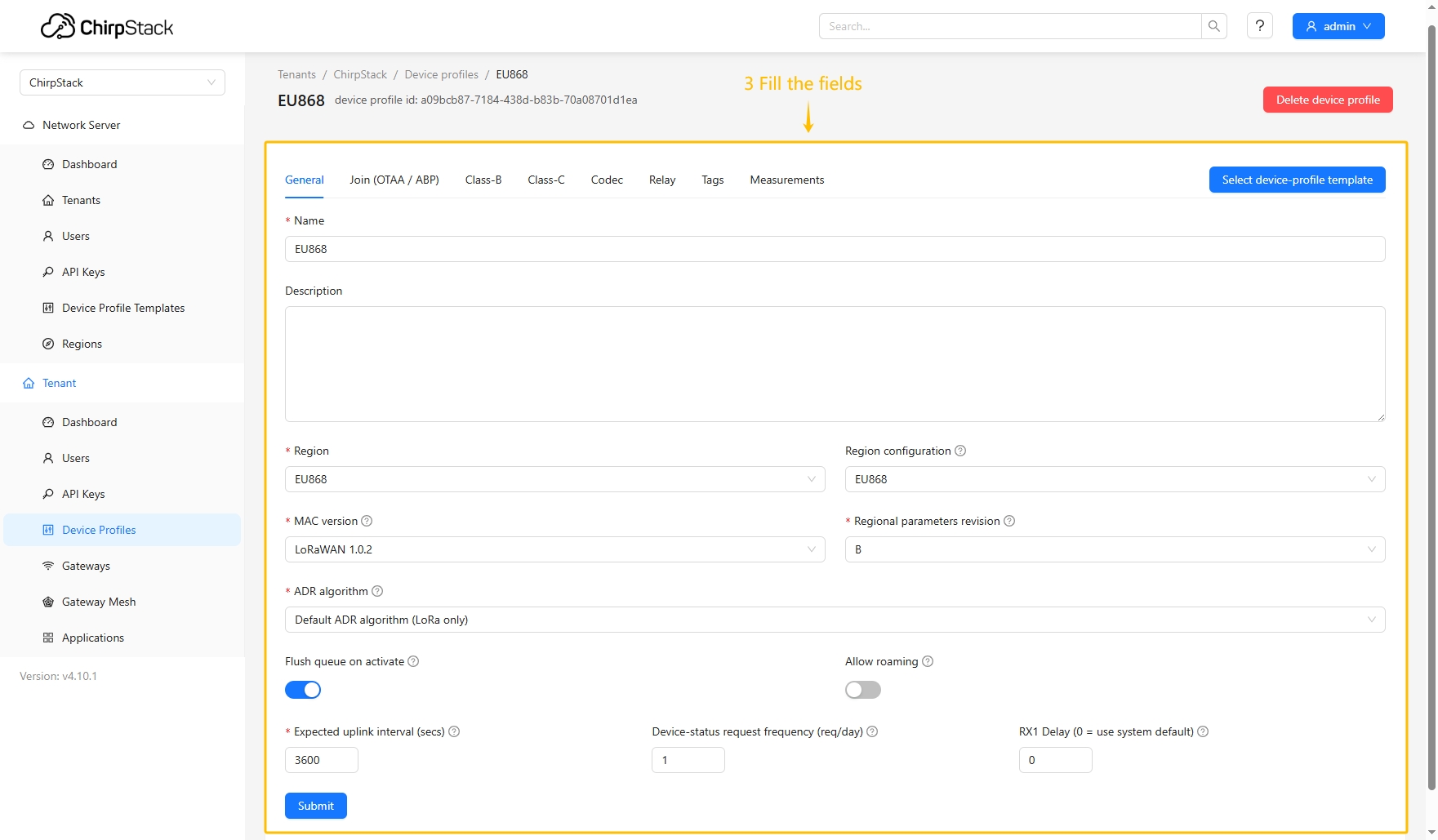 Login to Chirpstack server. Go to the “Device profiles ” page and click on Add device profile button.
