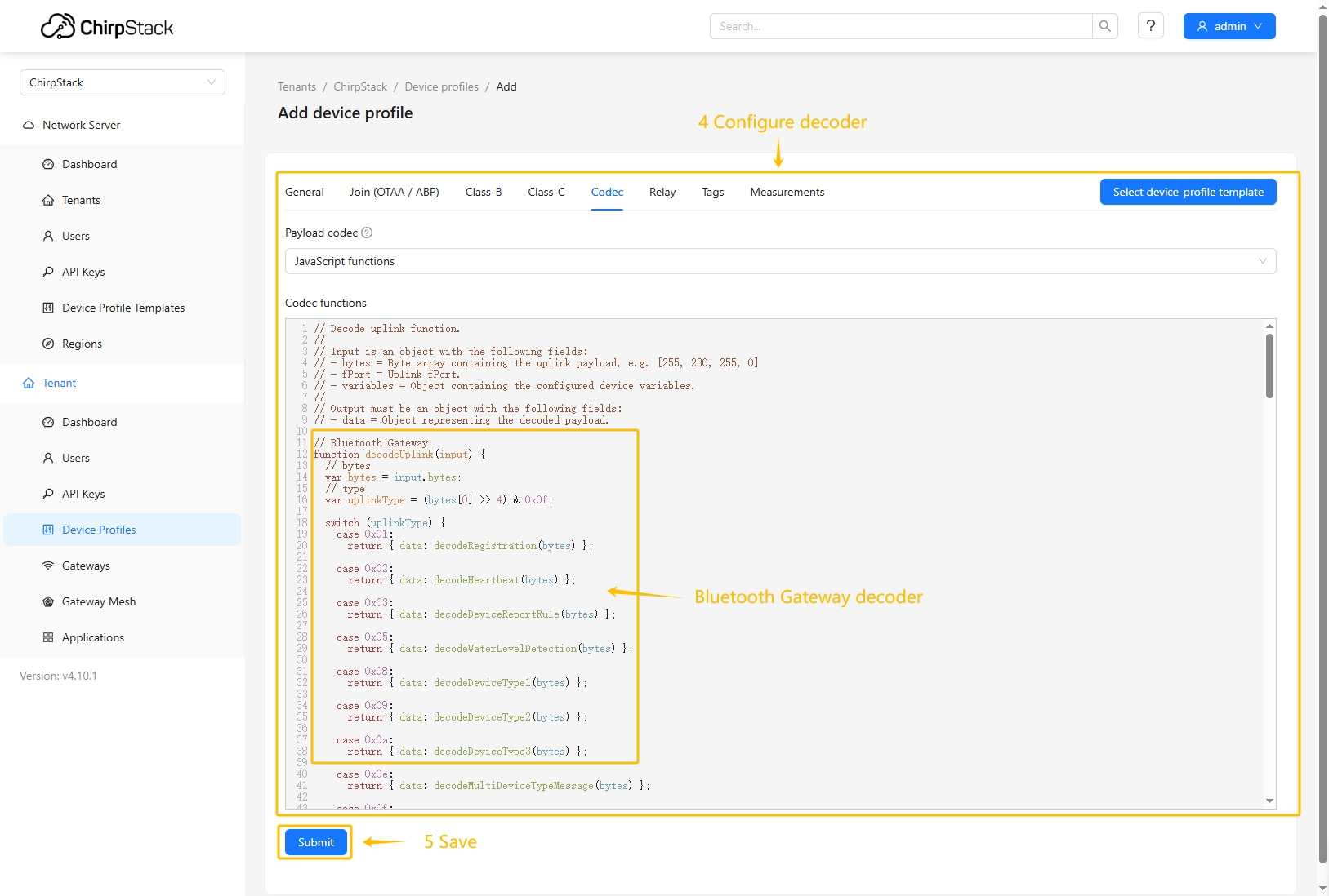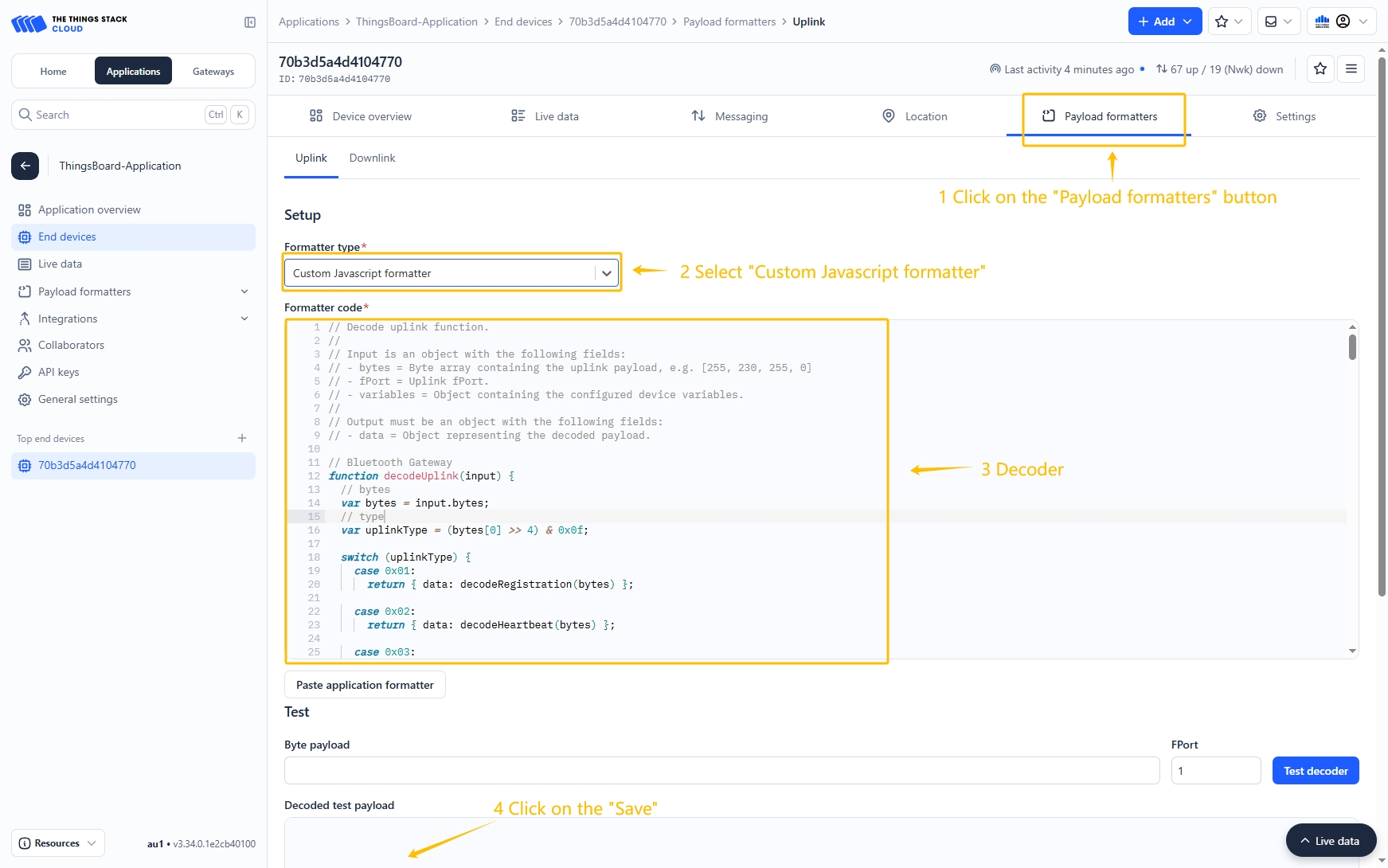 Go to the Payload formatters page and select Custom JavaScript formatter as the Formatter type . Paste the decode function into the editor and click the Save changes button.