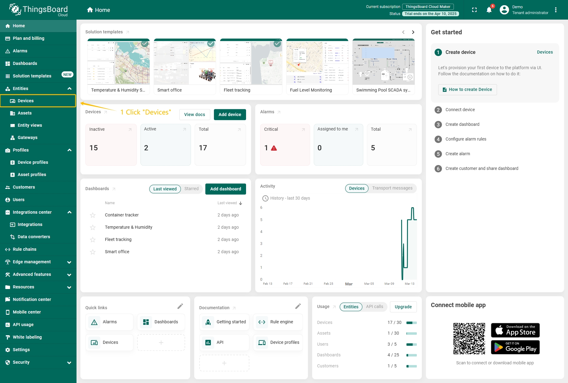 Explore the platform documentation to learn more about key concepts and features. For example, configure alarm rules or dashboards .