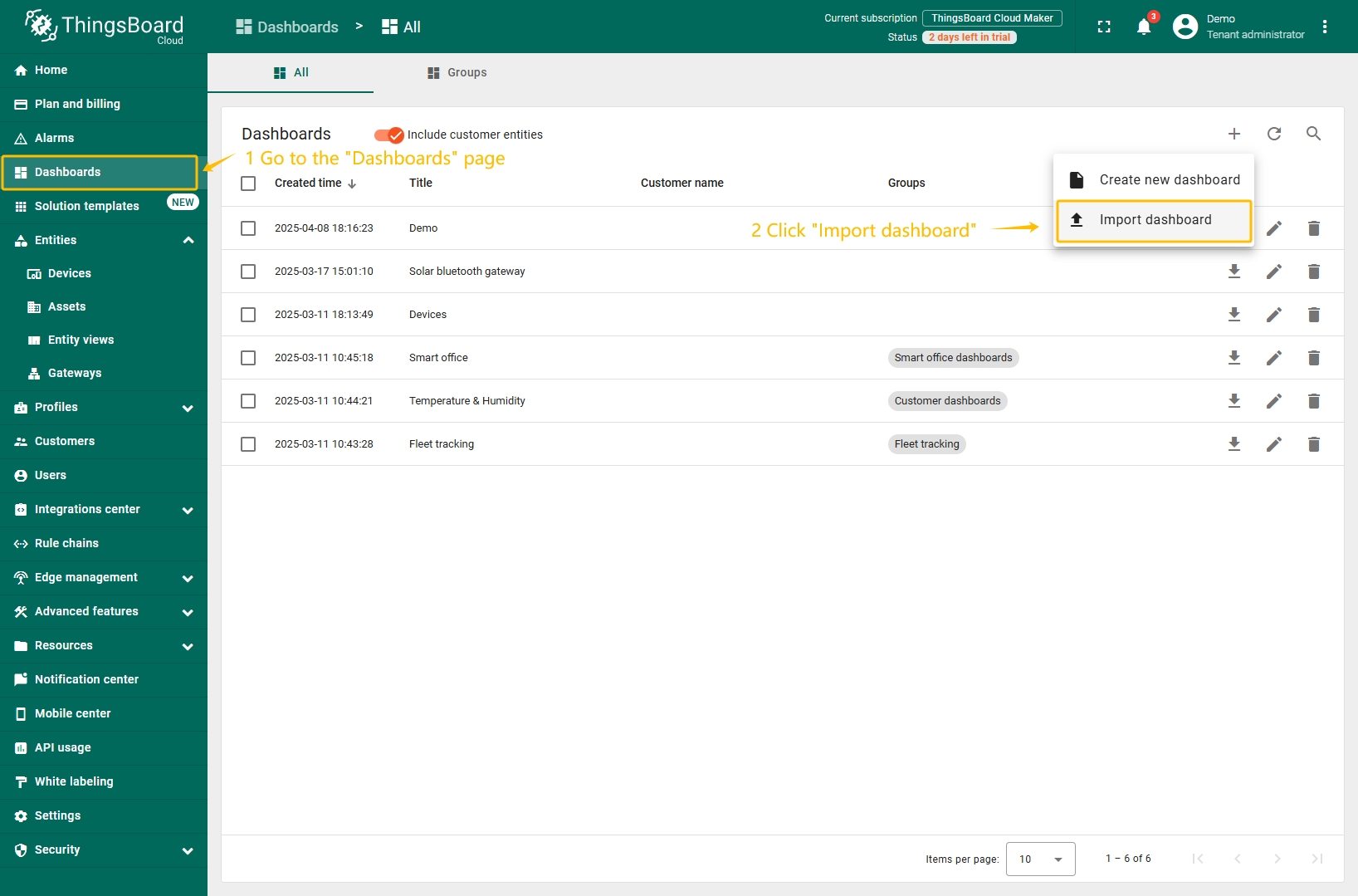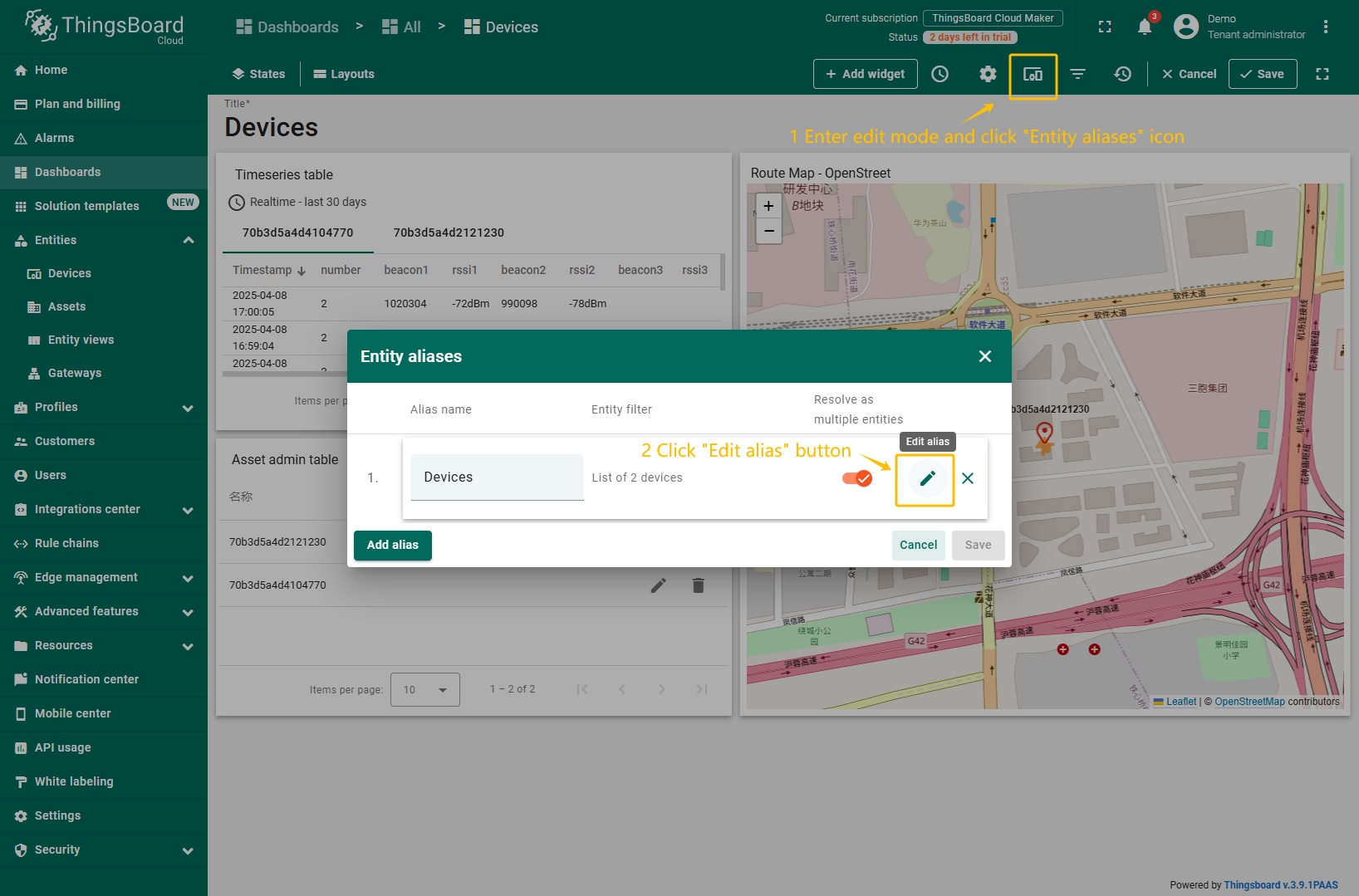 To open the imported dashboard, click on it. Then you should specify your device in entity alias of the dashboard.
