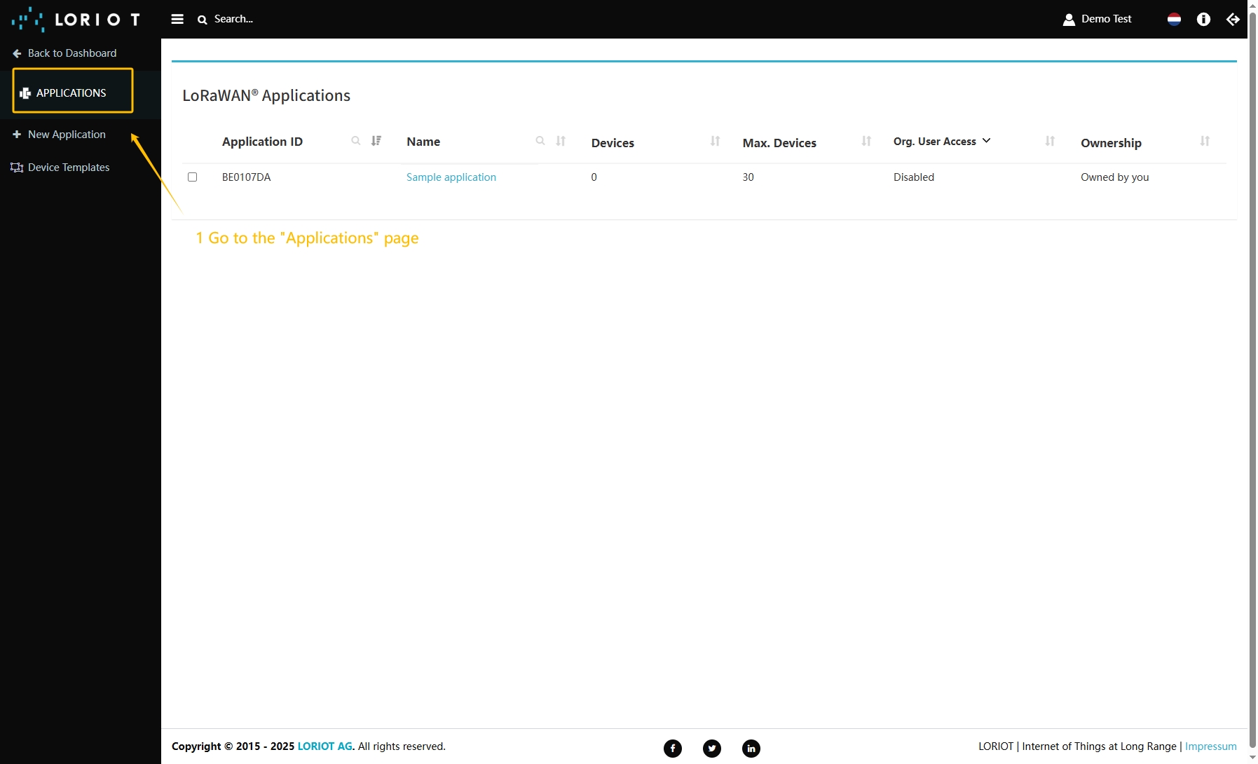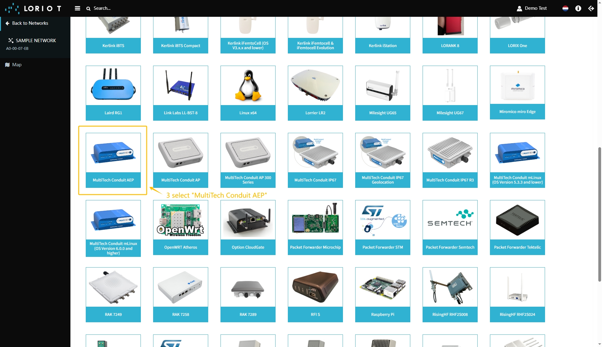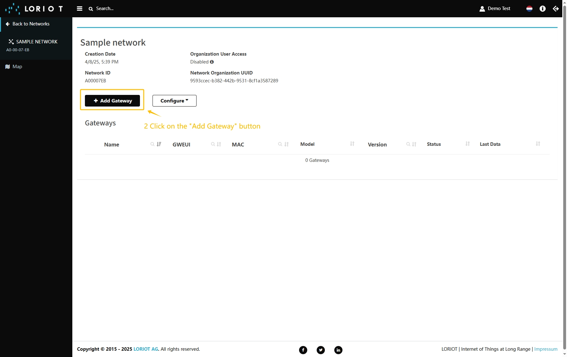 Login to Loriot server. Open the “Sample network ” or create a new one in the “Networks ” section.