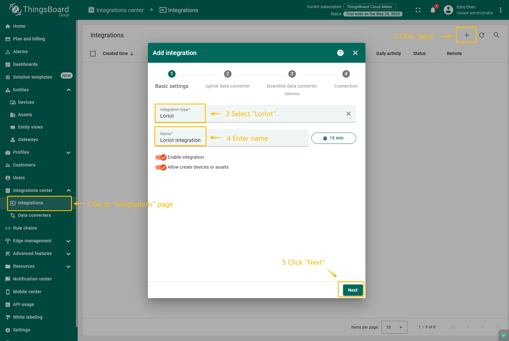 Click “plus ” icon button in the upper right corner to add new integration. Select type “Loriot ”. Then, click “Next ” button.