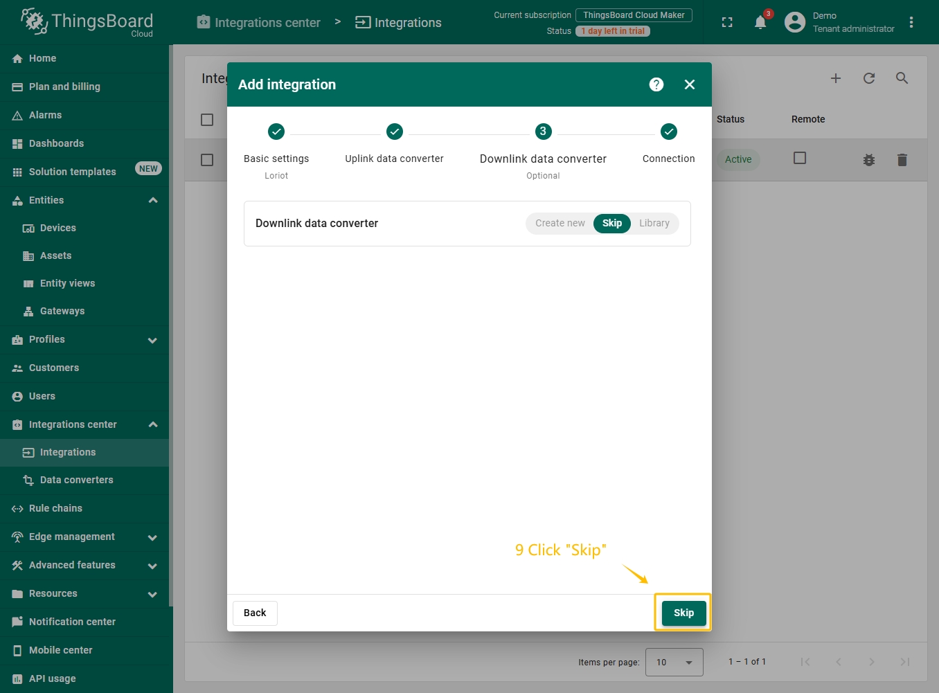Leave the “Downlink data converter ” field empty. Click on “Skip ” button.