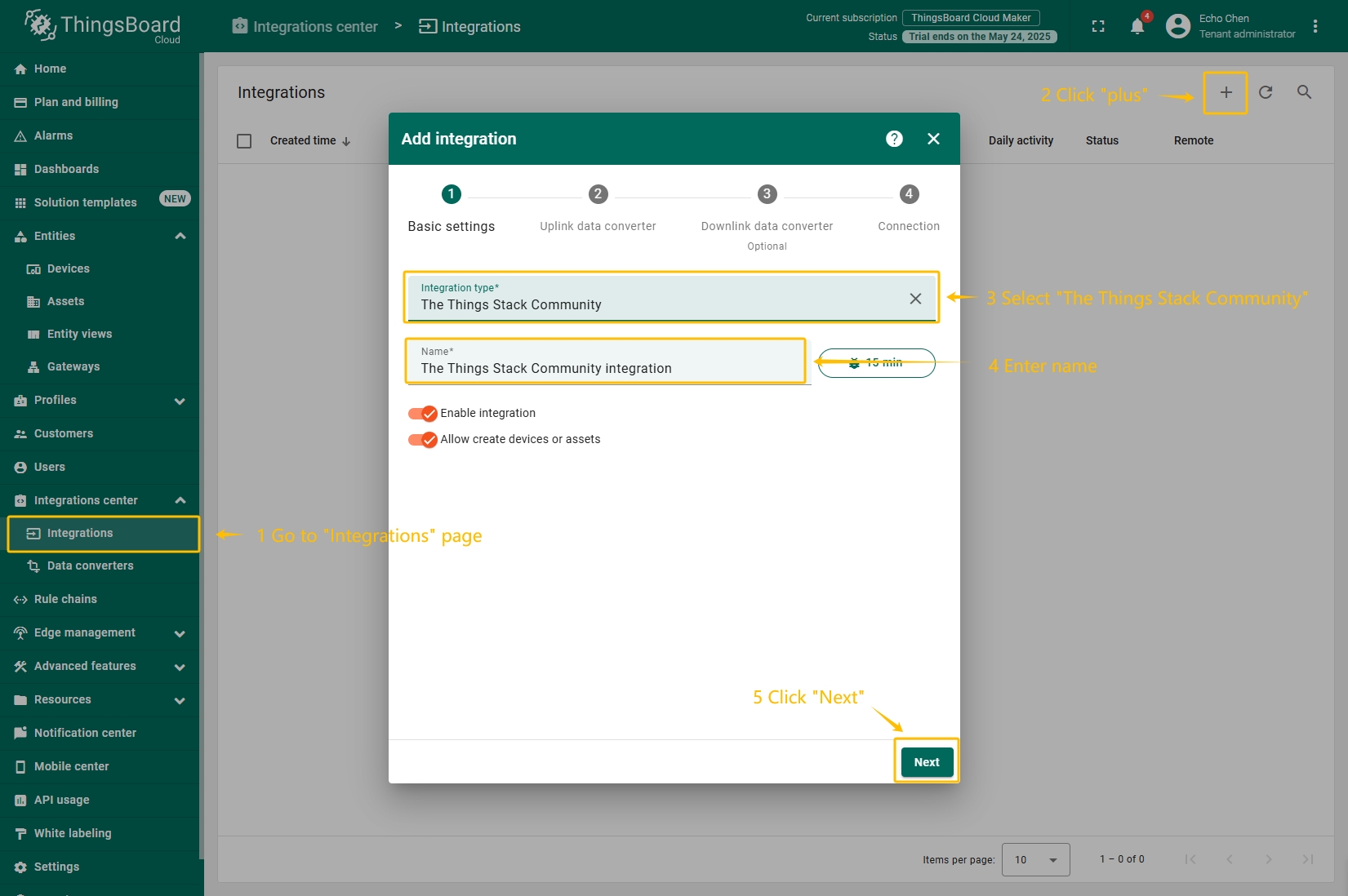 Click “plus ” icon in the upper right corner to add new integration. Select type “The Things Stack Community ”. Then, click “Next ” button.