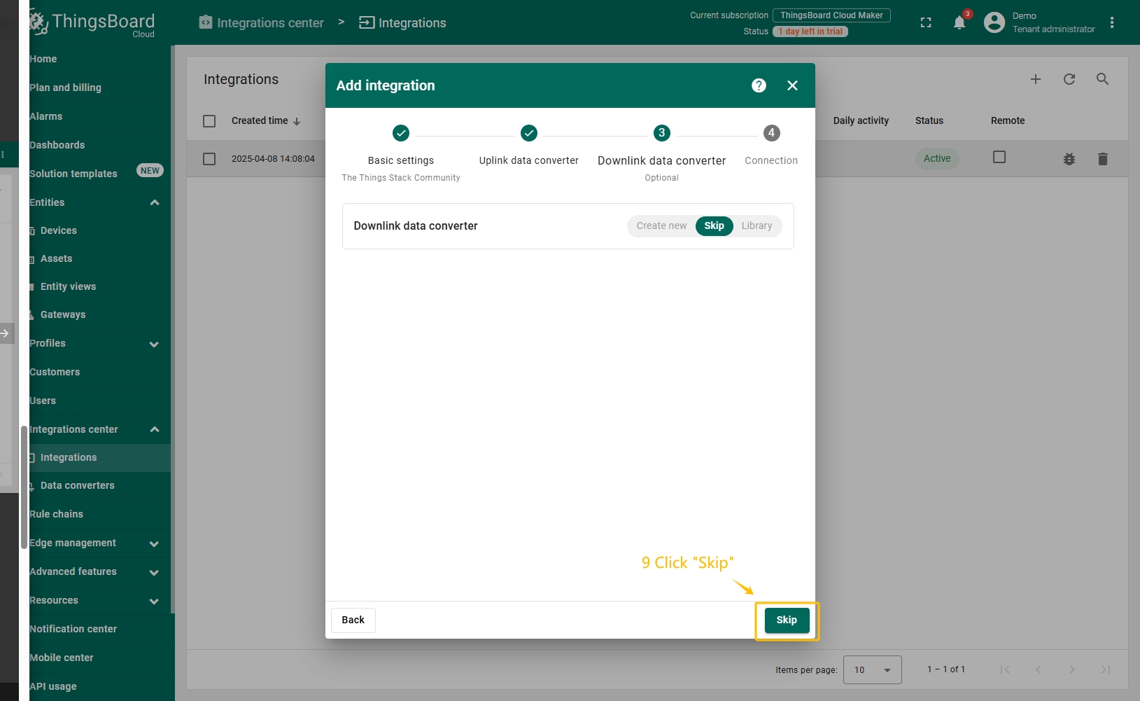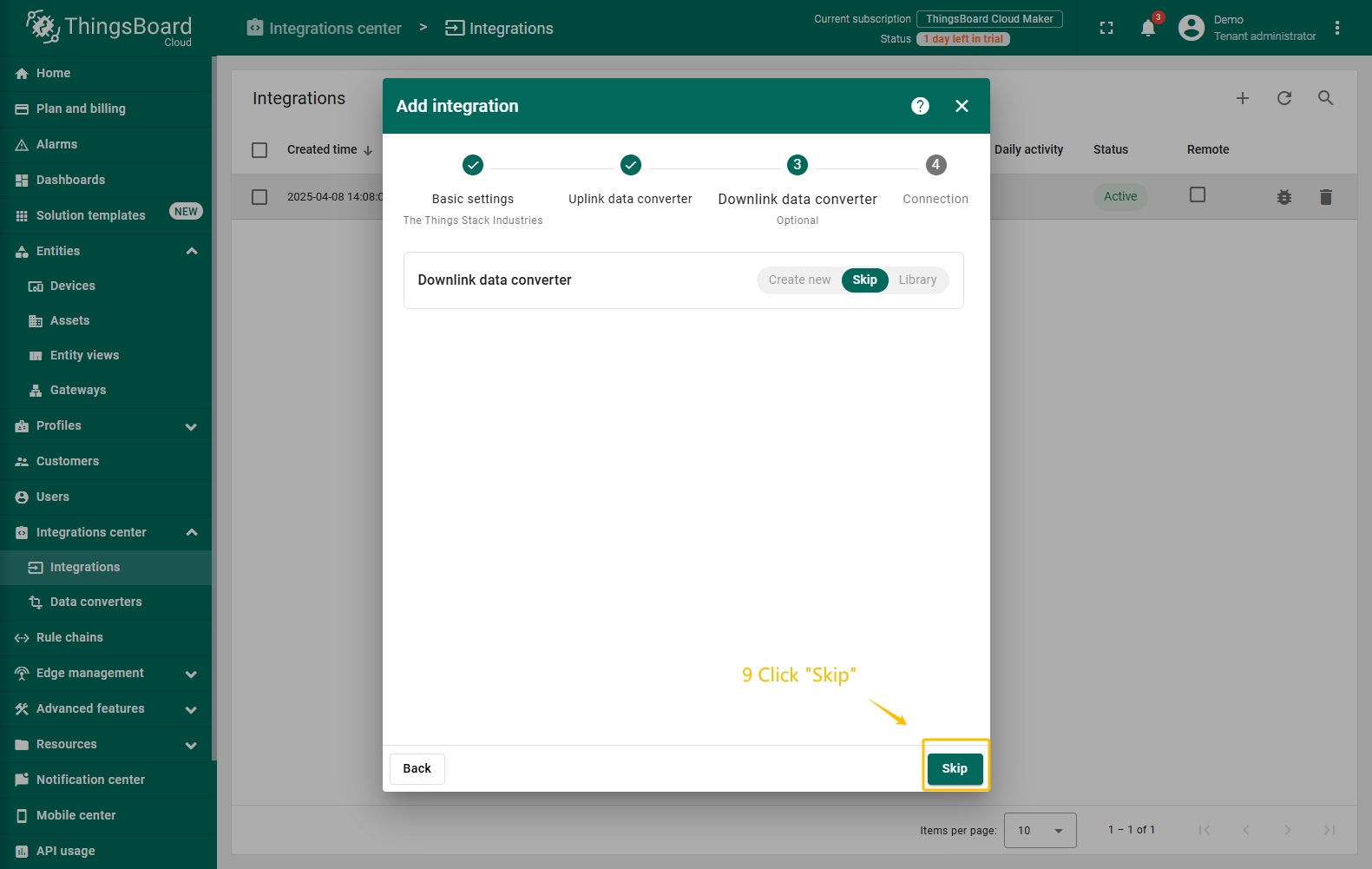 Leave the “Downlink data converter “field empty. Click on “Skip “button.