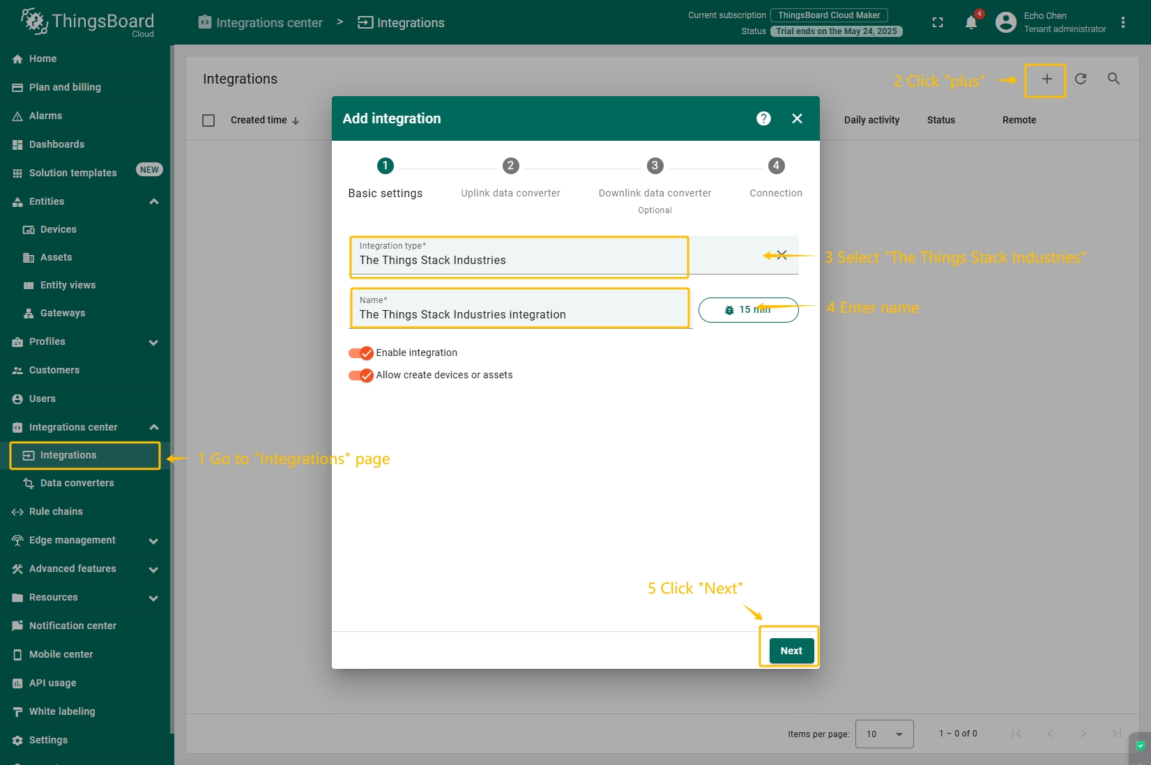 Click “plus “icon in the upper right corner to add new integration. Select type “The Things Industries Integration ”. Then, click “Next ” button.