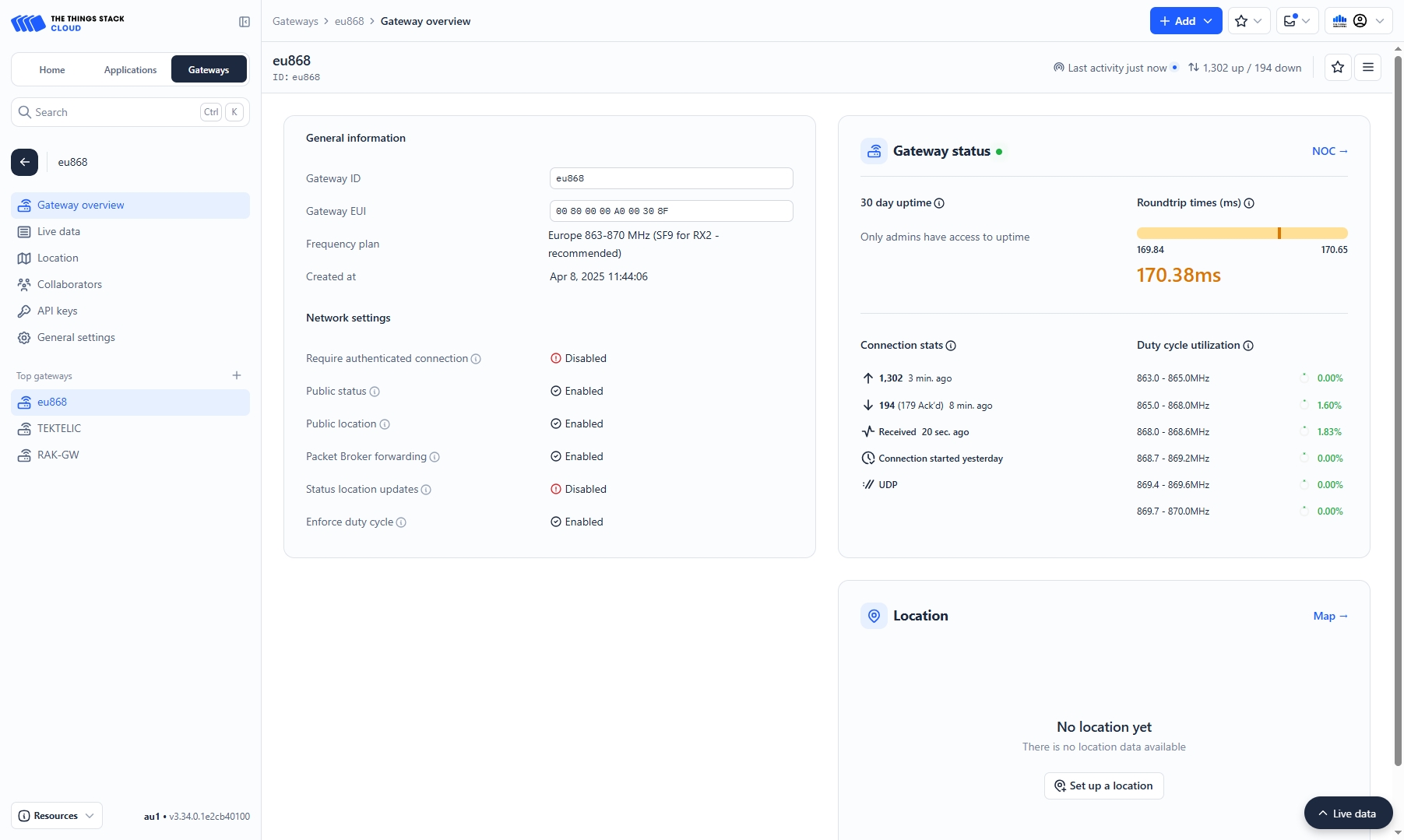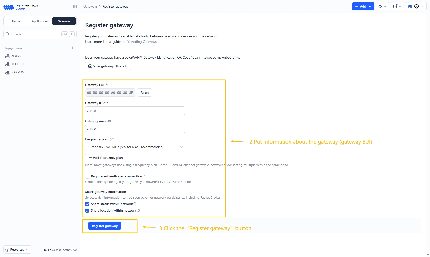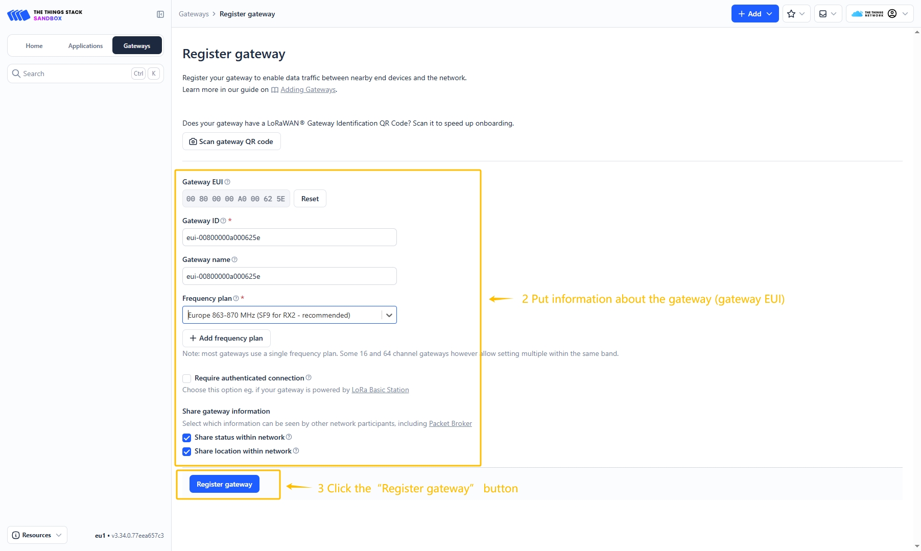 Put information about the gateway (gateway EUI) and click the “Register gateway “button.