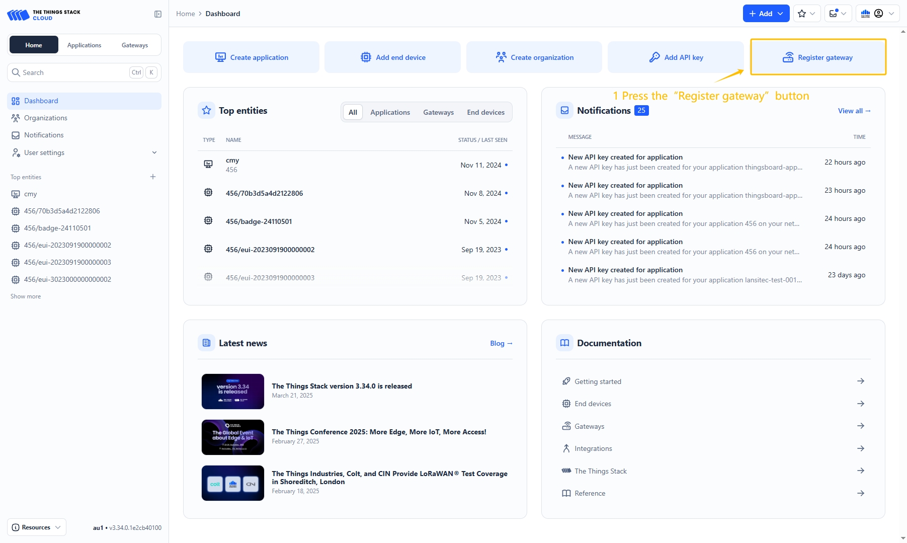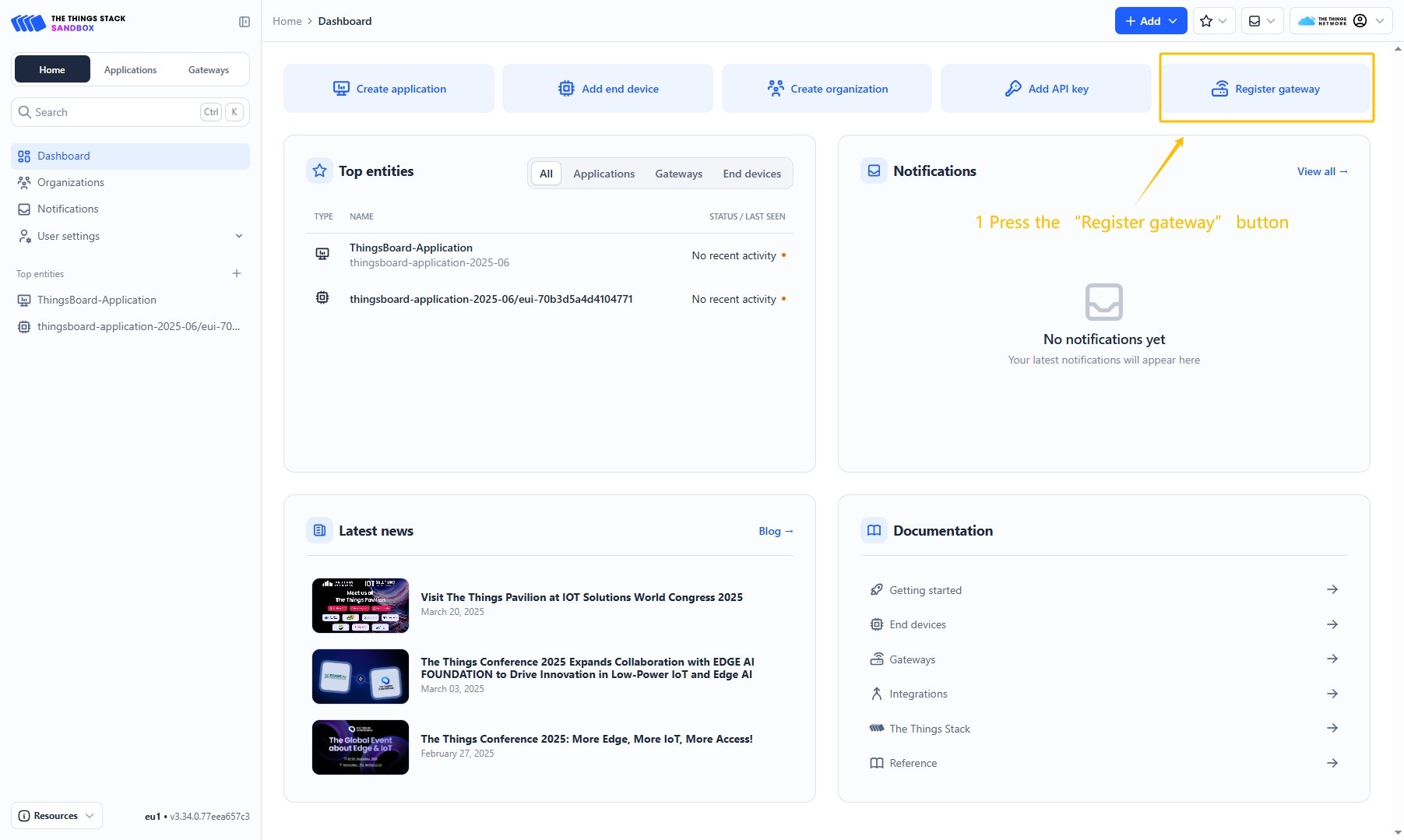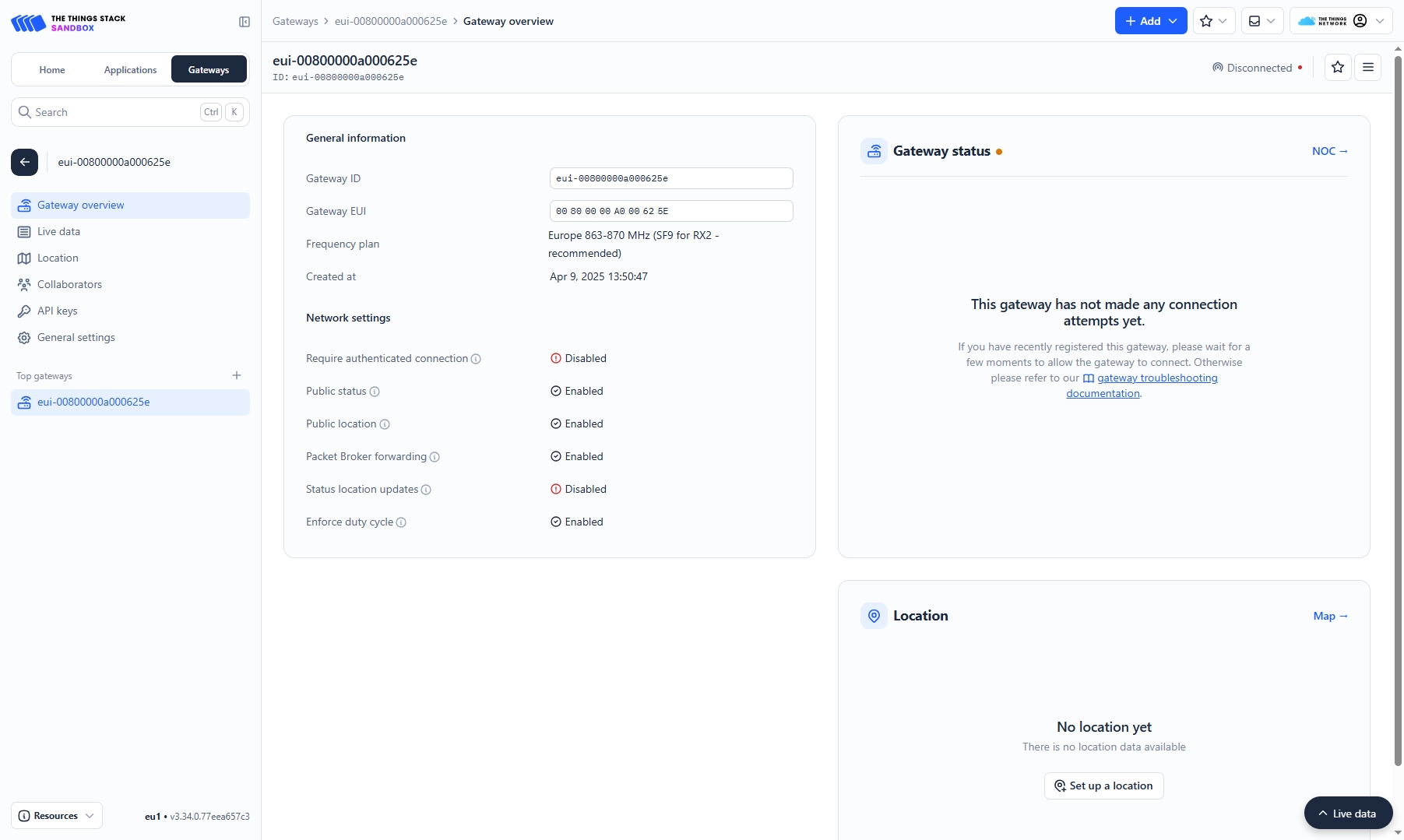 Put information about the gateway (gateway EUI) and click the “Register gateway “button.