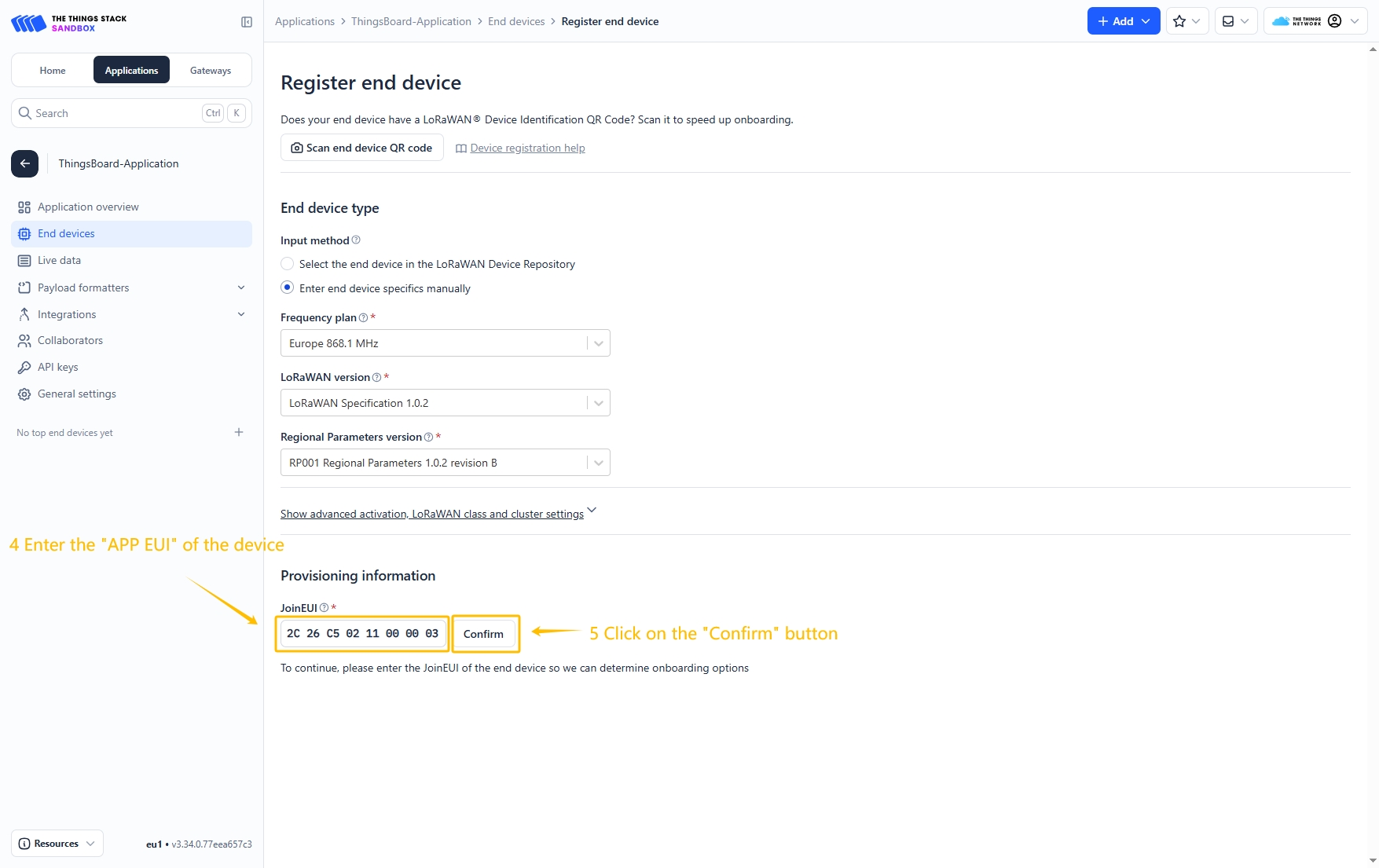 Put the APP EUI value to the JoinEUI field. Then, press the Confirm button.