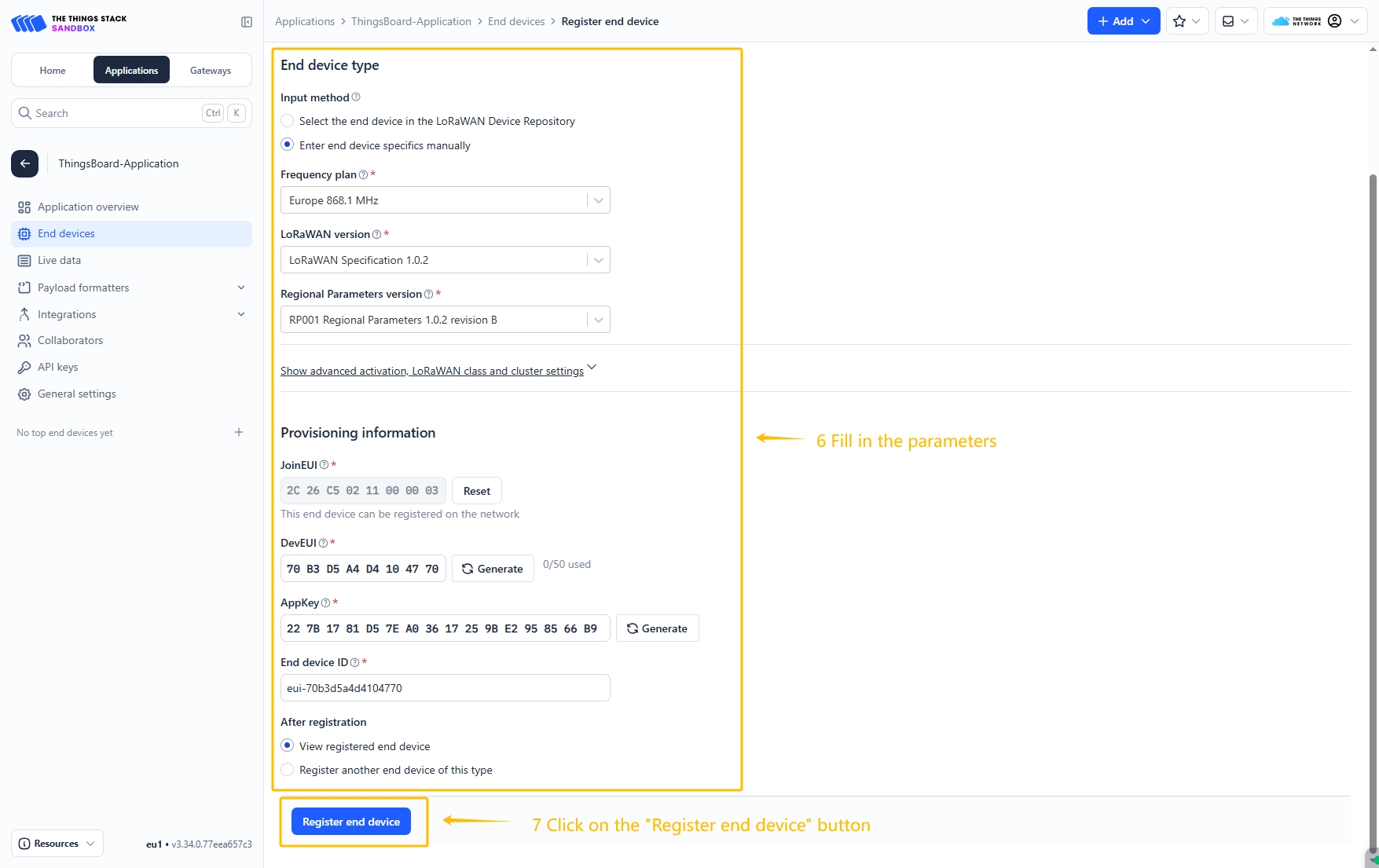 Region : eu1 (region where your application was registered inside The Things Industries Console);