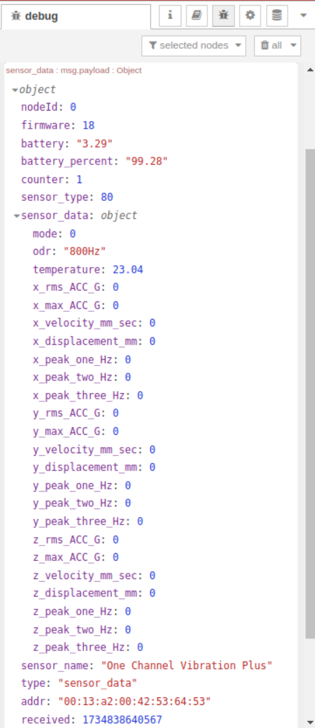 Once the sensor is powered on, it begins transmitting data, and you will start seeing incoming messages. The “Wireless Gateway” node decodes the sensor data and forwards it through its output terminal to the “Debug” node. These messages are displayed in the debug window of the Node-RED editor. After activating the NCD Vibration Sensor, the Debug window should display messages similar to the following: