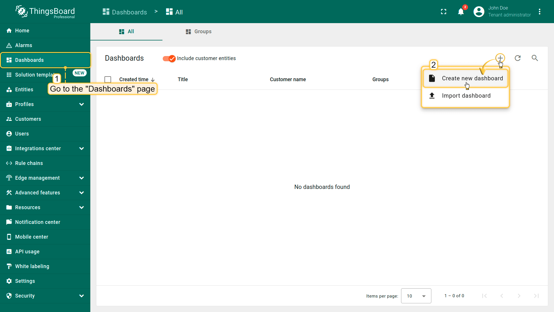 Navigate to the “Dashboards” page through the main menu on the left of the screen. By default, you navigate to the dashboard group “All”. Click the “+” sign in the upper right corner of the screen, and select “Create new dashboard” from the drop-down menu;