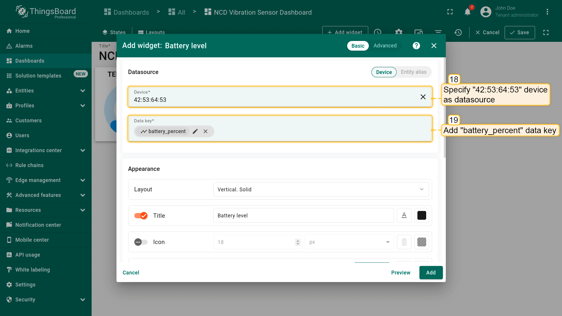 You will need to set the “Device” property again with the NCD device that we previously added. The next step is to set the “Data key” property. Click on the “Data key” field, and this will display the list of variables emitted by the NCD vibration sensor. From the list, select the property defined as “battery_percent”;