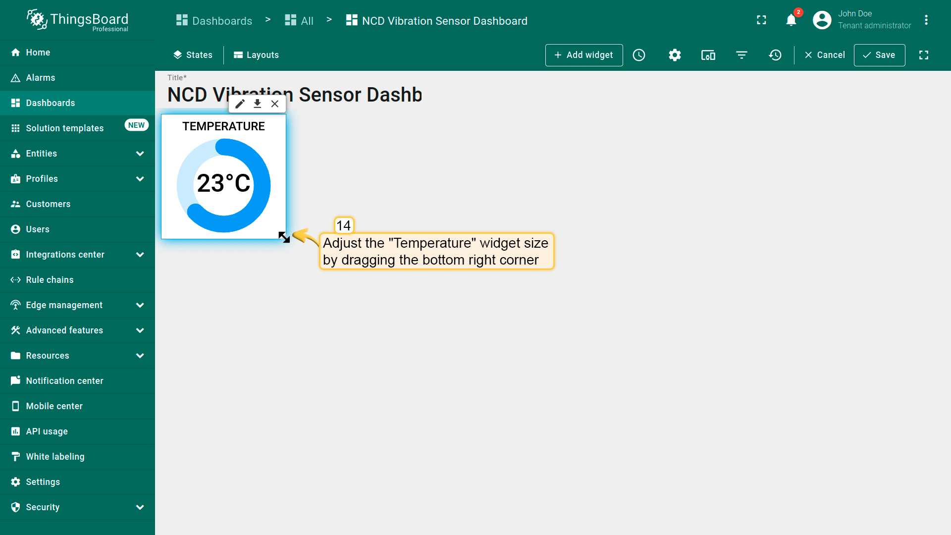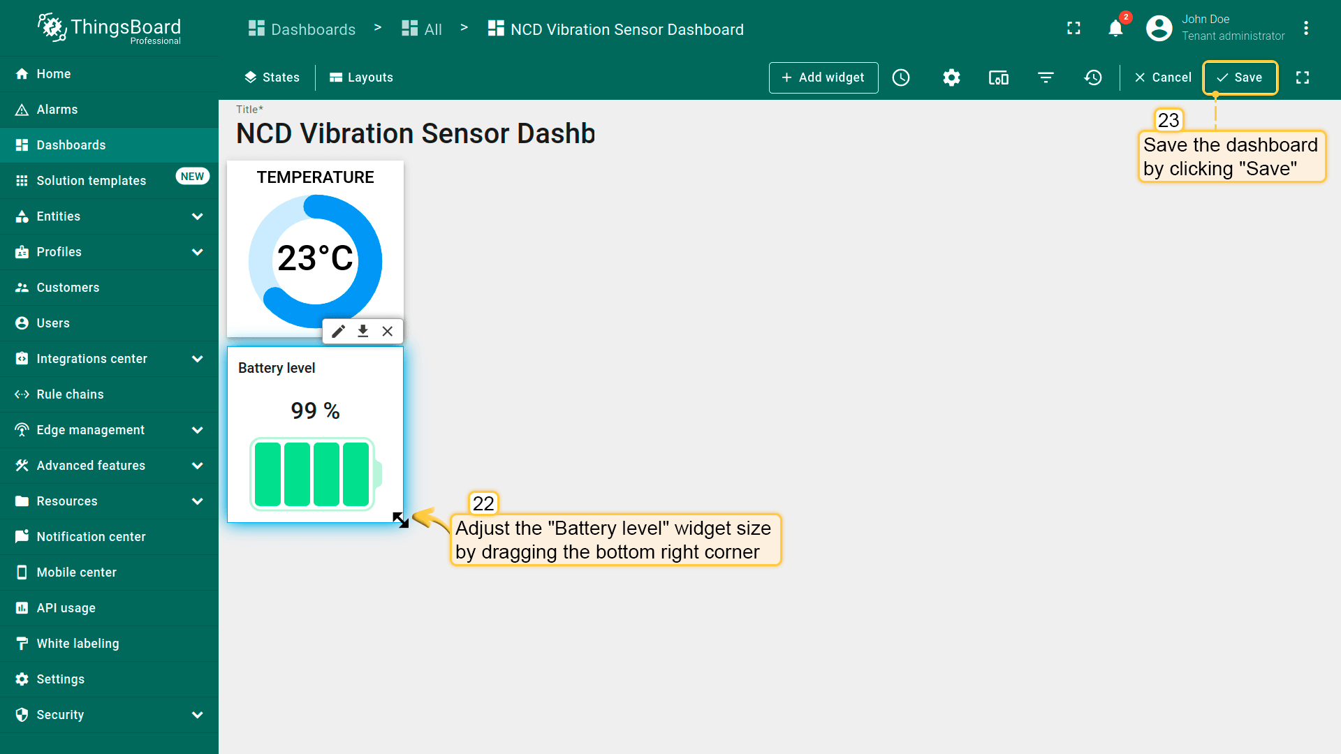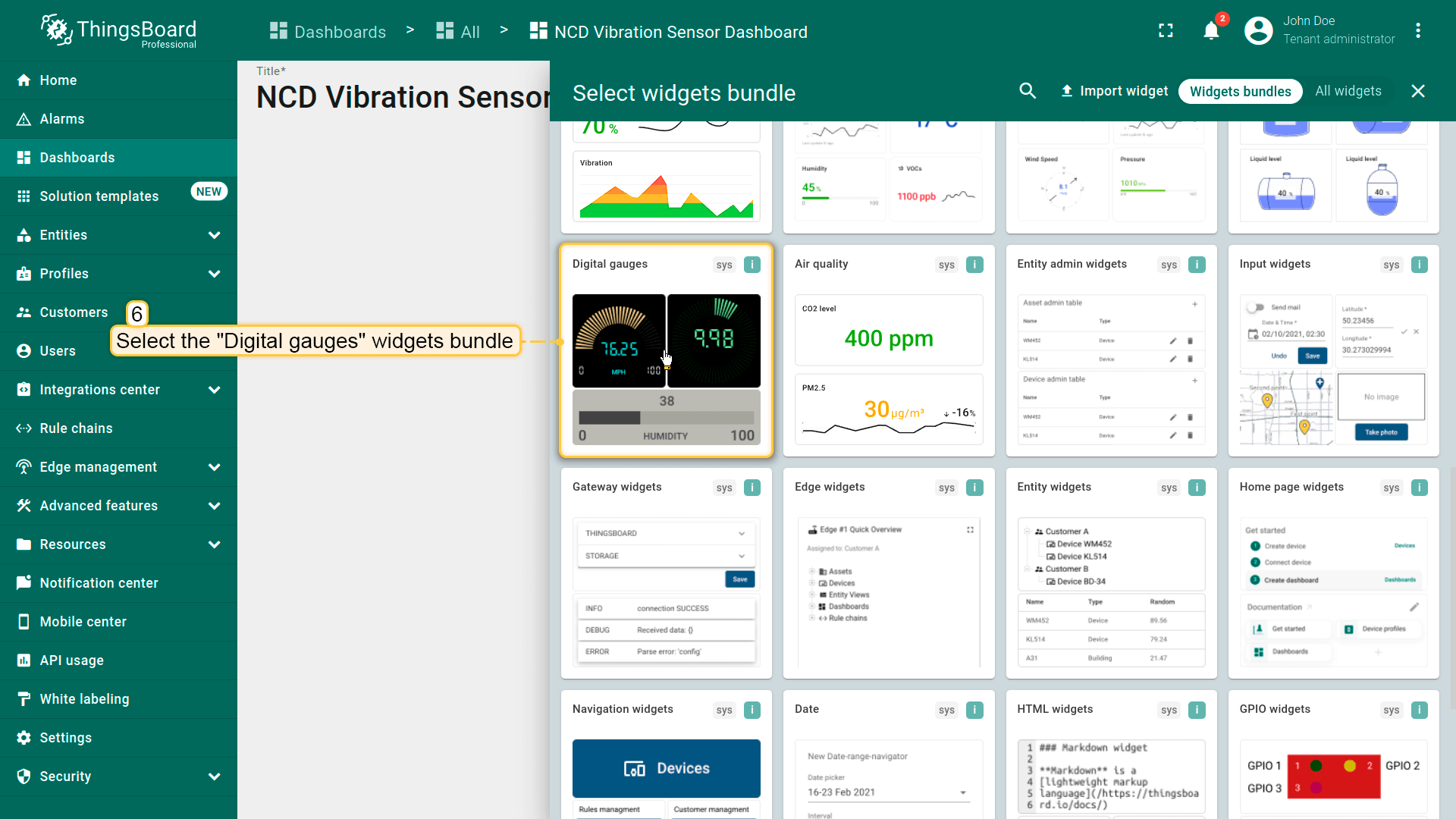 This way, you can add as many widgets as you need to your dashboard. The steps for doing so are the same as shown earlier. Each widget can be customized and adjusted, including style, color, unit of measurement, icon, elements, distribution, size, and many other options. You can also link each widget to the variables emitted by the vibration sensor.