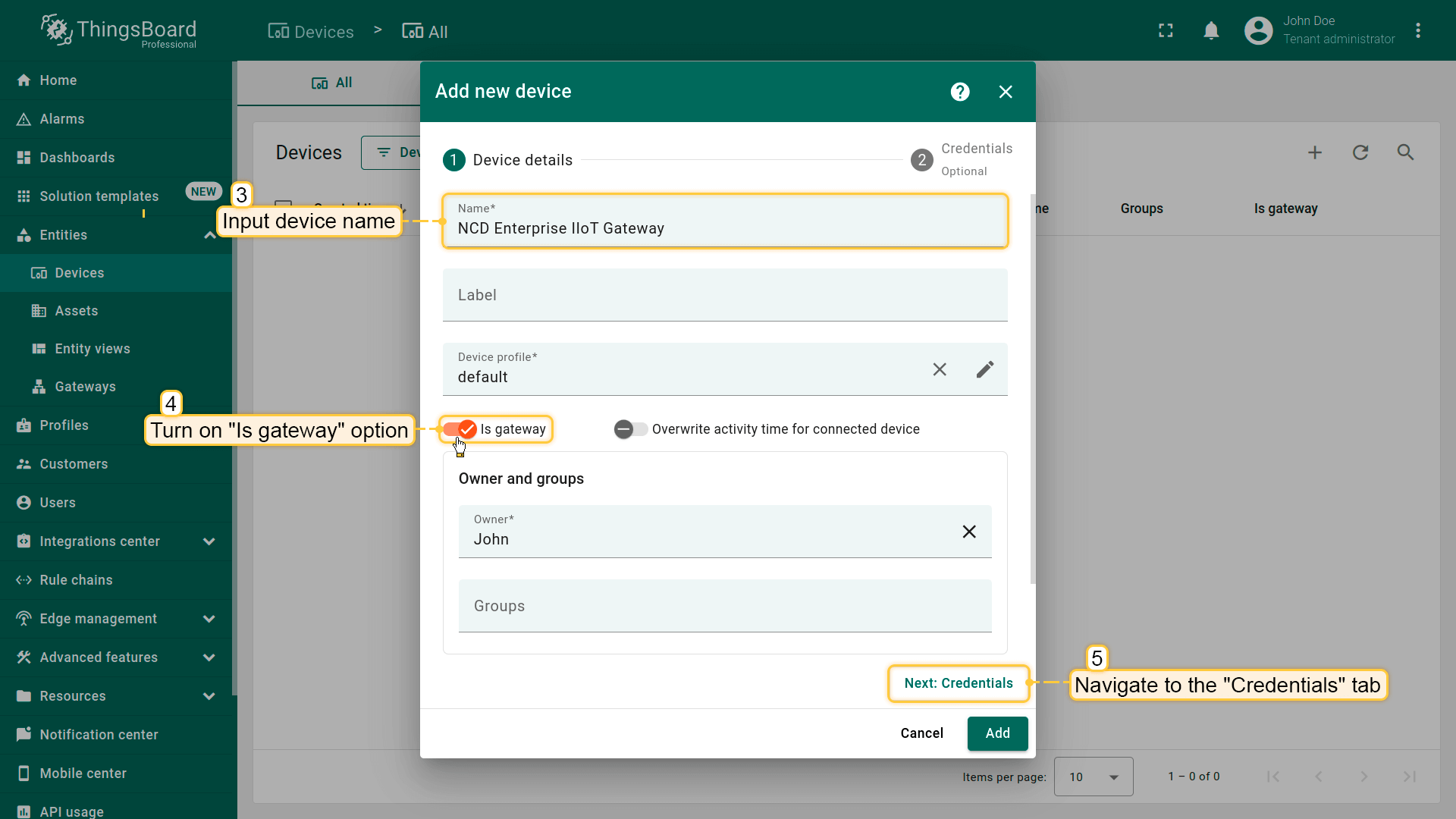 Once you do this, a new window will appear. You need to assign a name to the new device - in this case, we used “NCD Enterprise IIoT Gateway”. You can also specify a label, groups, description, and other parameters. Make sure to enable the “Is gateway” toggle. Next, click “Next: Credentials”.