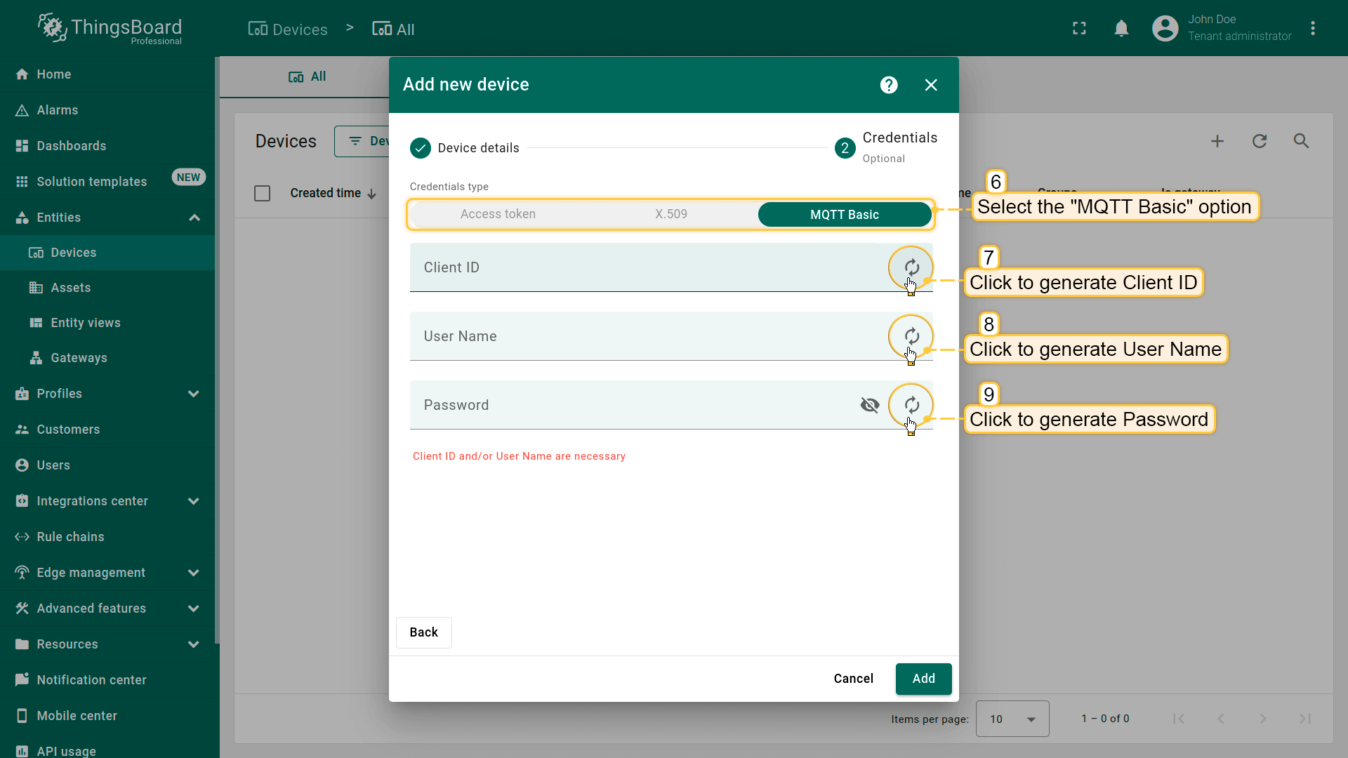 You will now be taken to the device credentials window. Select the “MQTT Basic” option (you can optionally add additional MQTT security layers here). Next, generate the Client ID, Username, and Password by clicking the “Generate” button next to each option. These credentials are required for configuring the Node-RED MQTT node to establish a connection with the Enterprise IIoT Gateway.