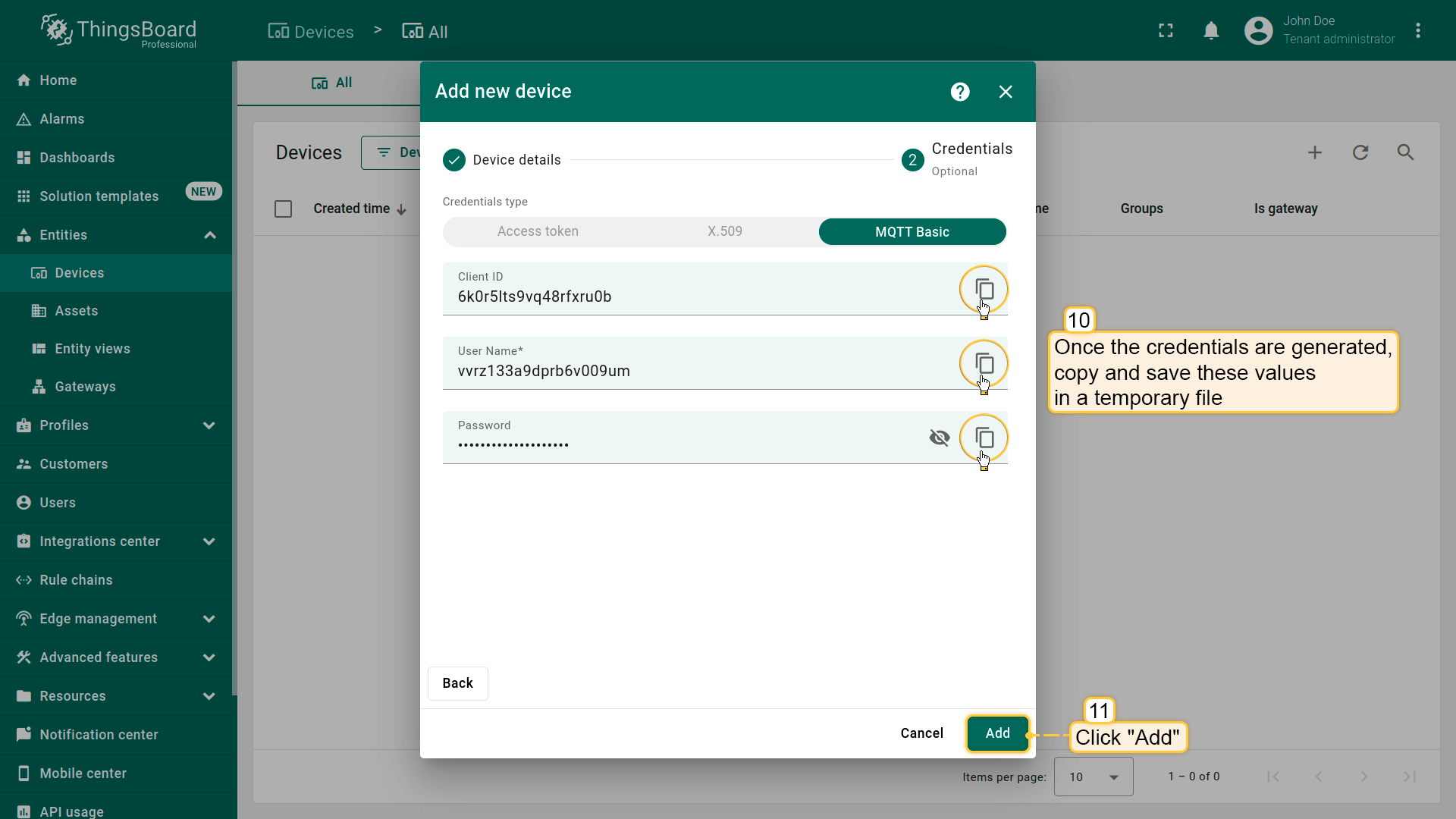 After generating the credentials, use the “Copy” button to obtain each value. We recommend saving these values in a temporary file, as we will use them later in the Node-RED MQTT node in this guide. Next, click “Add”.