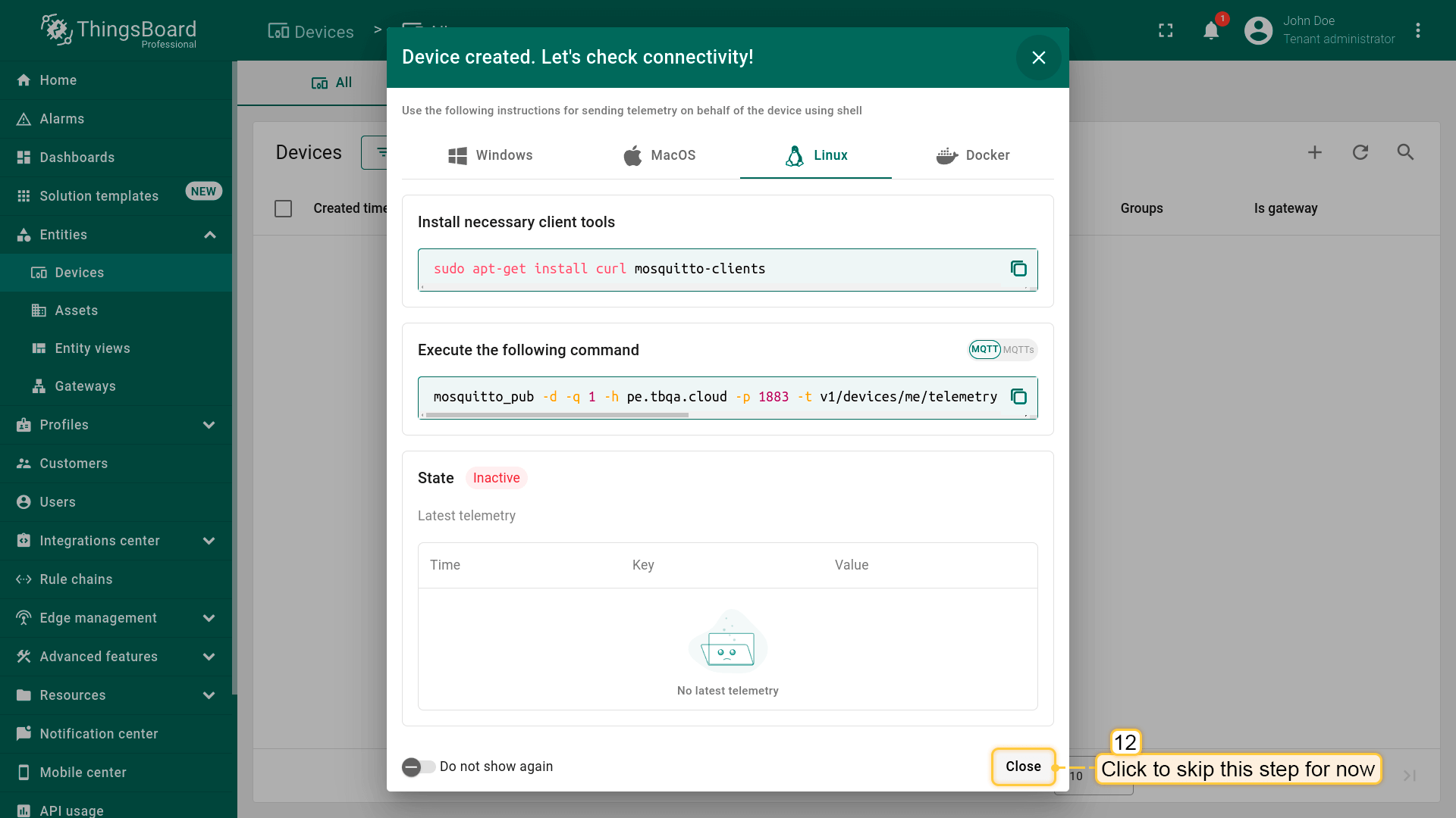After this, a new window will appear, allowing you to test the connectivity. However, since we are using a Gateway, a different set of MQTT topics is required for proper integration with the IoT Hub gateway device. You can skip this step. For now, we will identify the MQTT server to use for the connection: “mqtt.iothub.magenta.at”. Click the “Close” button to proceed.