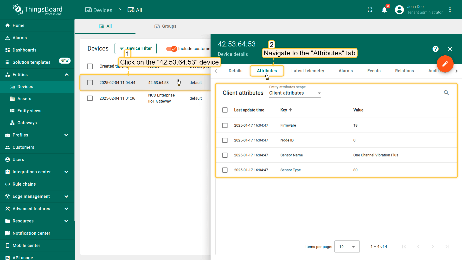 Now, return to the IoT Hub platform. You will notice that a new device has been automatically added, identified by its MAC address. Both the Enterprise IIoT Gateway and the Sensor device will show an Active state. The system will automatically update the device status based on the sensor's communication. You can click on the newly added device to explore its details, Attributes, Latest telemetry, Alarms, Events, Relations, Audit Logs, among others. By reviewing these sections, you can gain deeper insights into the device’s status and performance within the IoT Hub platform.