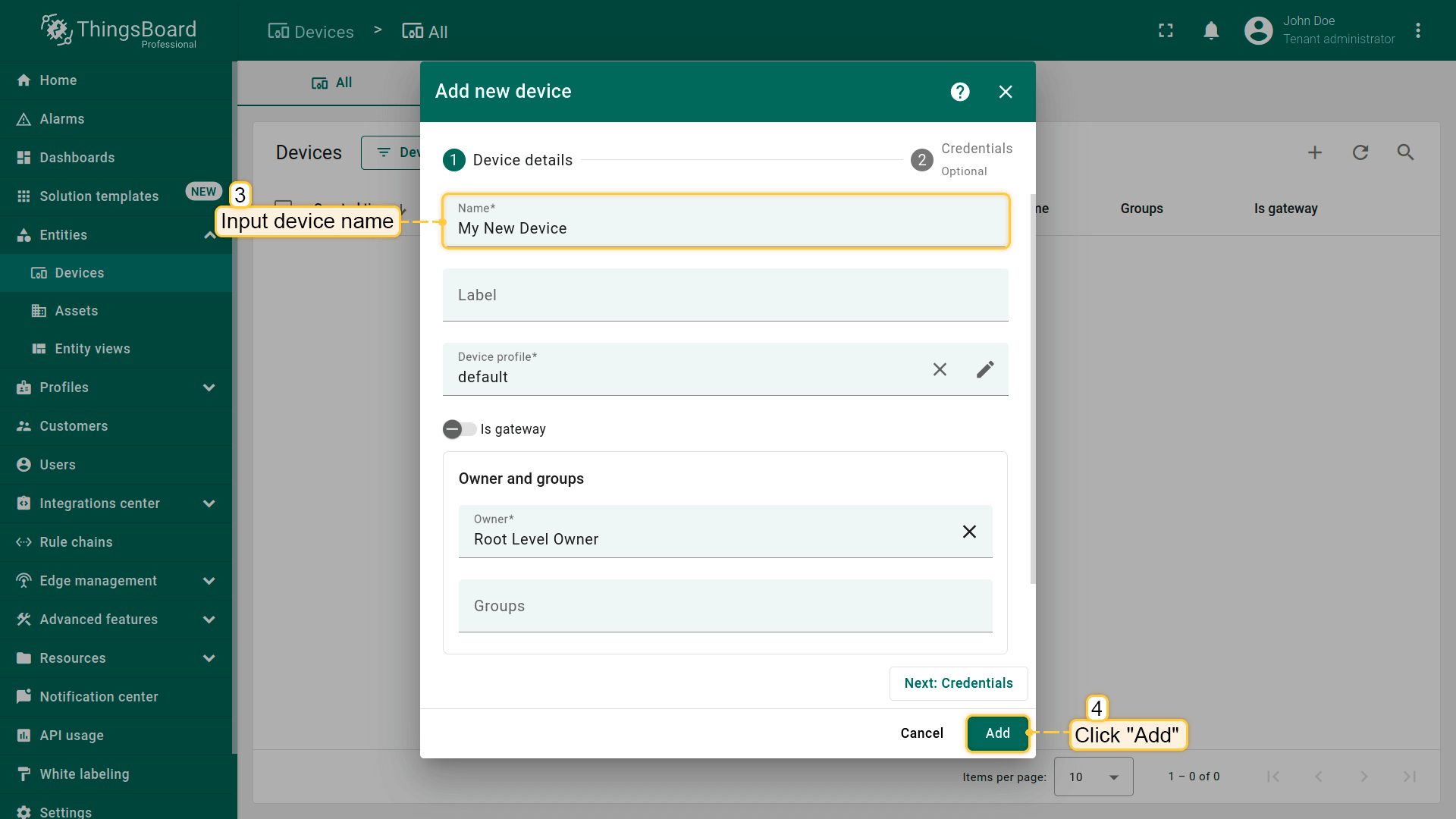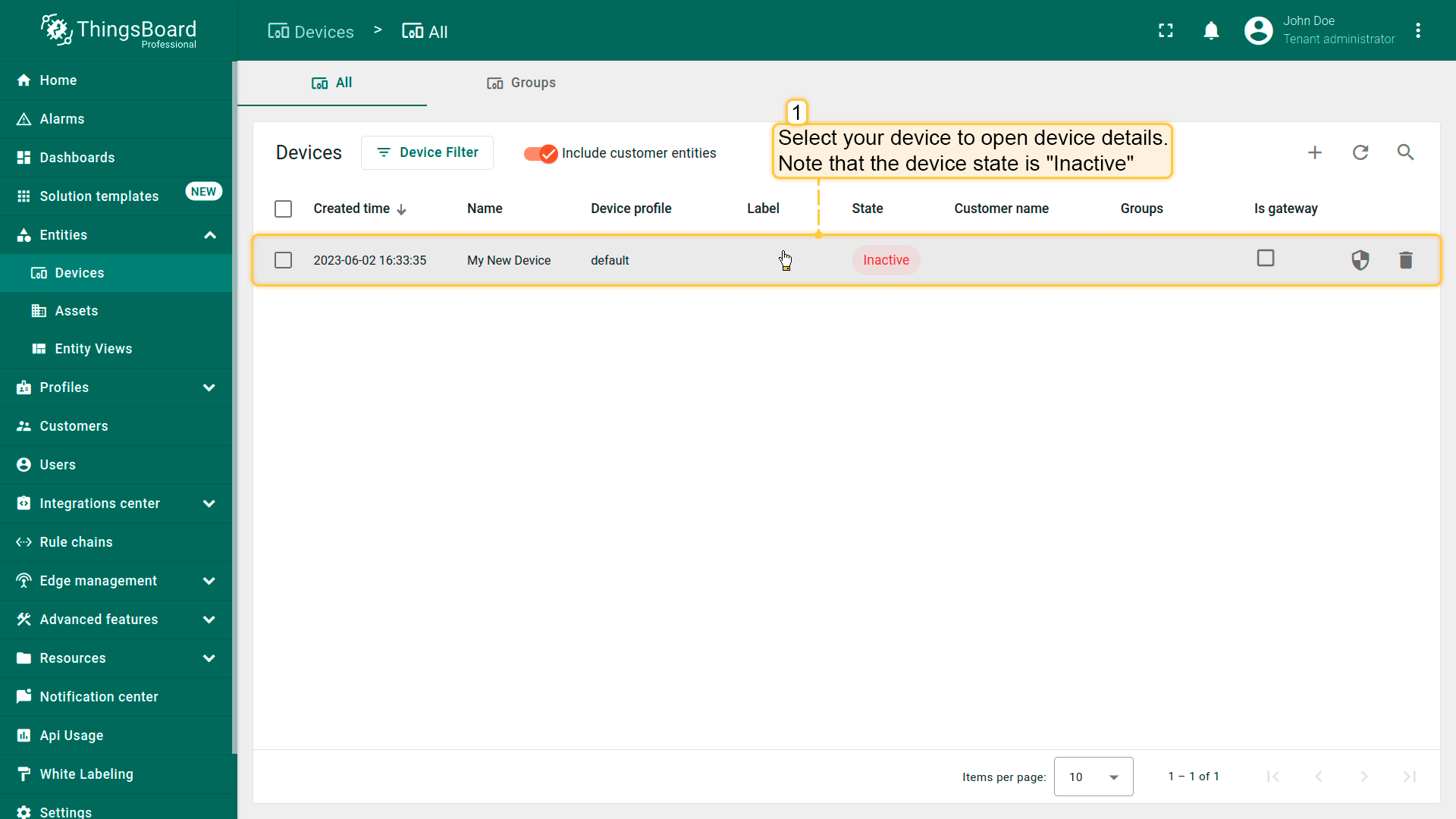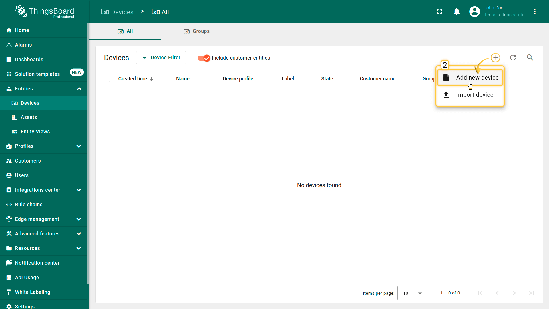 By default, you navigate to the device group “All”. Click on the “+” icon in the top right corner of the table and then select “Add new device”.