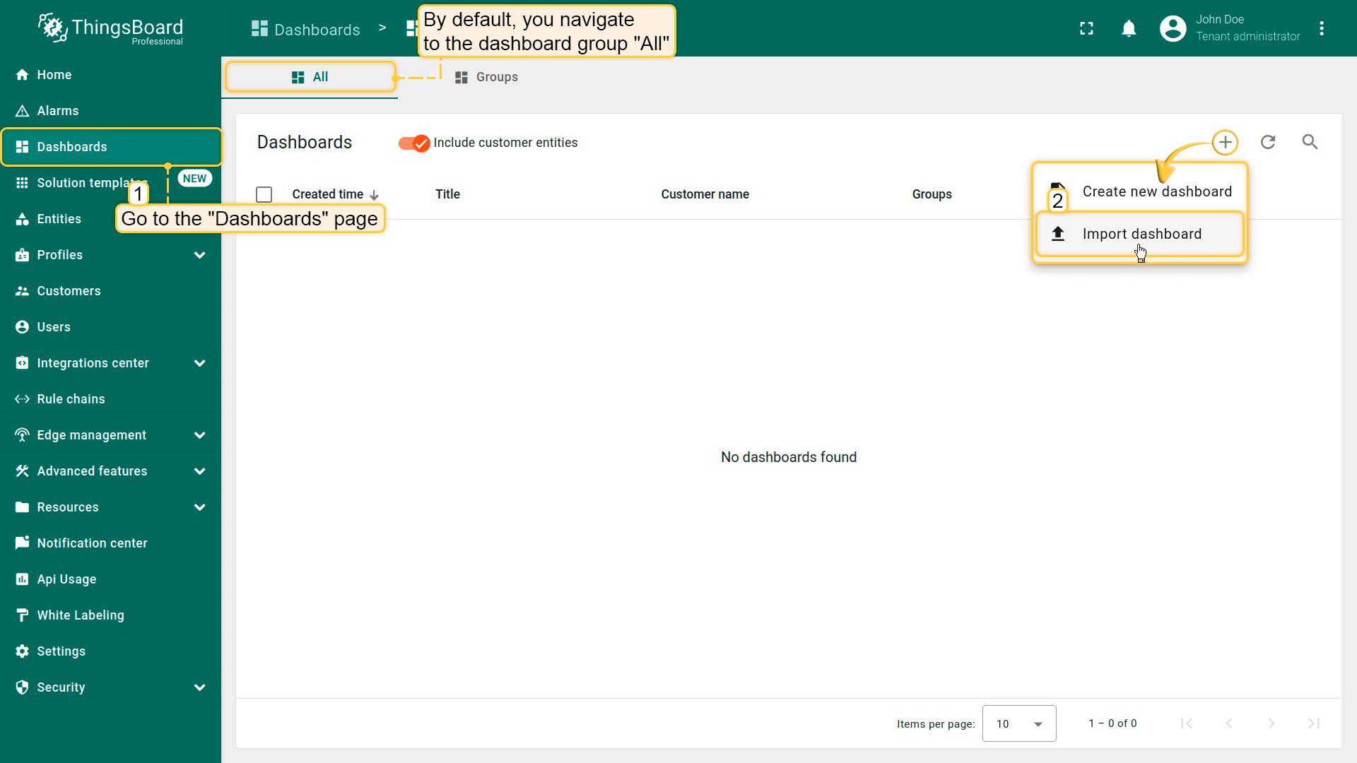 Import dashboardYou are able to import a dashboard in JSON format. To import a dashboard, you should go to the Dashboard group and click on the “+” button in the upper right corner of the page and choose “Import dashboard”. The dashboard import window should pop up, and you will be prompted to upload the JSON file and click “Import”. Below, you can find the dashboard JSON file: Check and control device data dashboard After importing, we should choose an entity alias for our device. If you did everything right, you have to see the following dashboard: