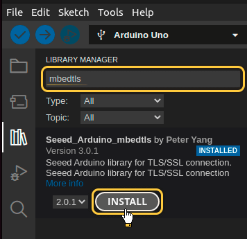 Put into library search field “mbedtls” and install the library - “Seeed_Arduino_mbedtls by Peter Yang”