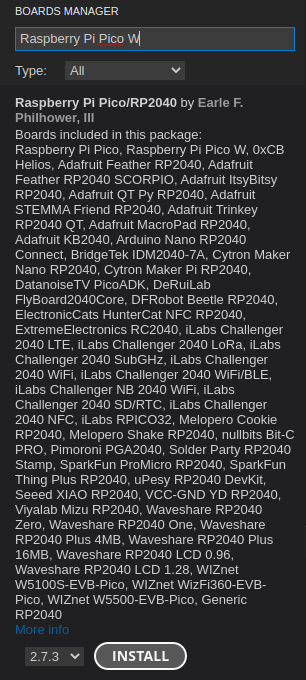 After the installation is complete, select the board by Board menu: Tools > Board > Raspberry Pi Pico/RP2040 > Raspberry Pi Pico W.