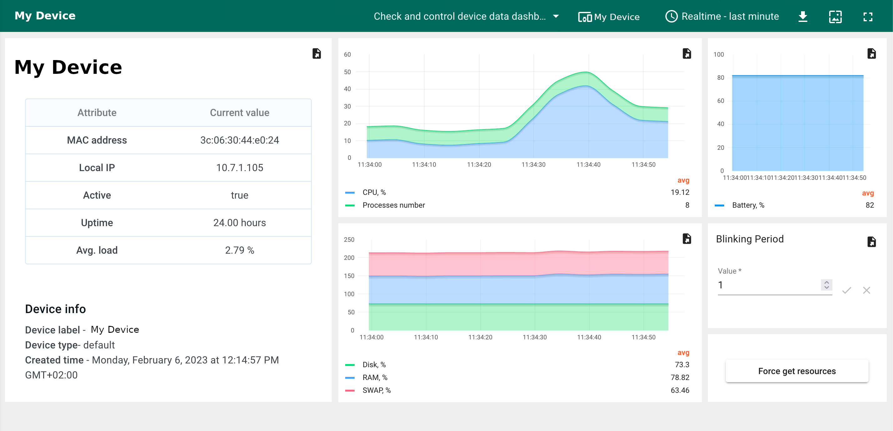 Also, let’s display single board computer attributes and telemetry on a dashboard. For this, you can create your own dashboard with your custom widgets or use a ready-made dashboard and simply import it.