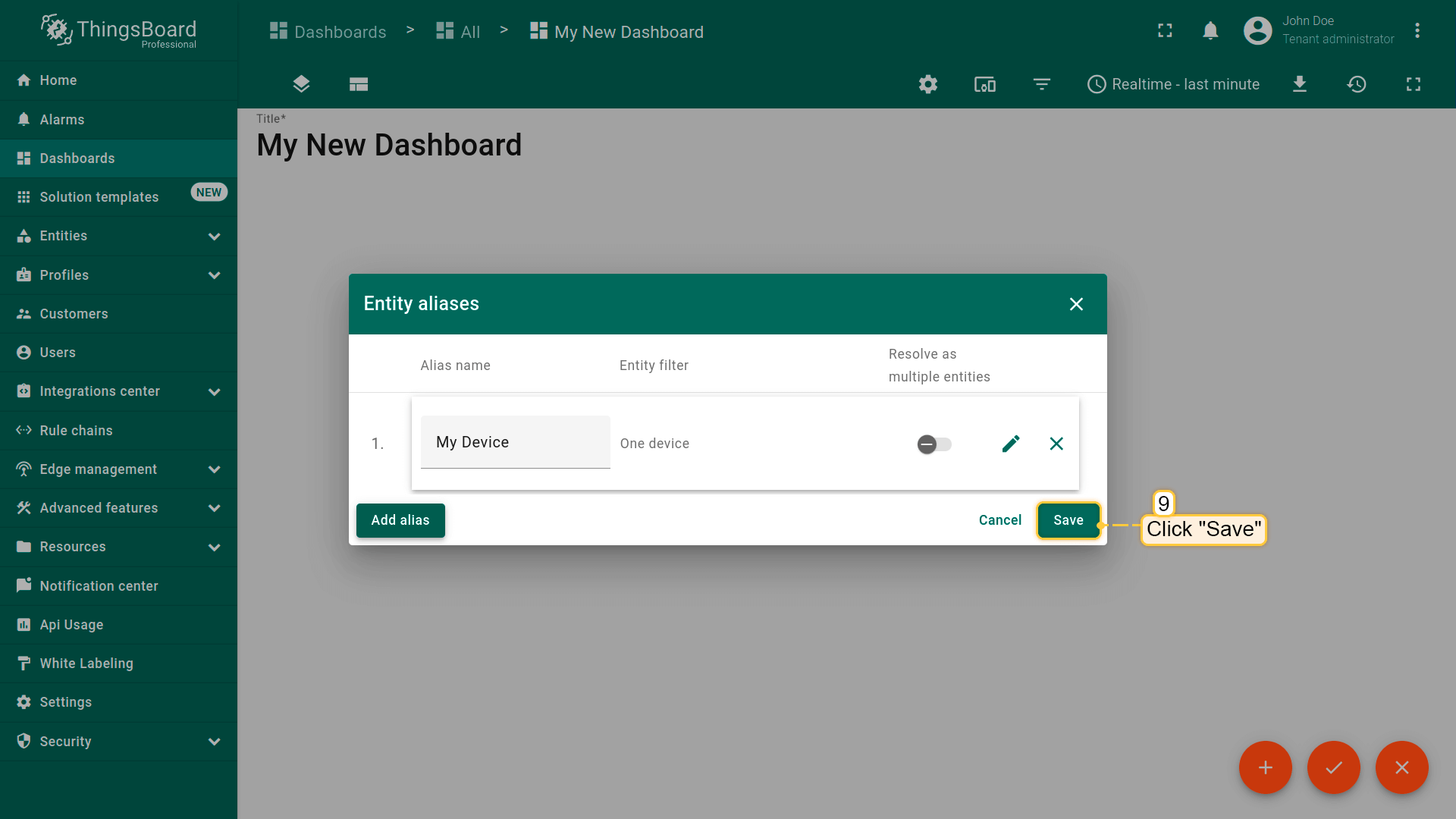 Import dashboardYou are able to import a dashboard in JSON format. To import a dashboard, you should go to the Dashboard group and click on the “+” button in the upper right corner of the page and choose “Import dashboard”. The dashboard import window should pop up, and you will be prompted to upload the JSON file and click “Import”. Below, you can find the dashboard JSON file: Check and control device data dashboard After importing, we should choose an entity alias for our device. If you did everything right, you have to see the following dashboard: