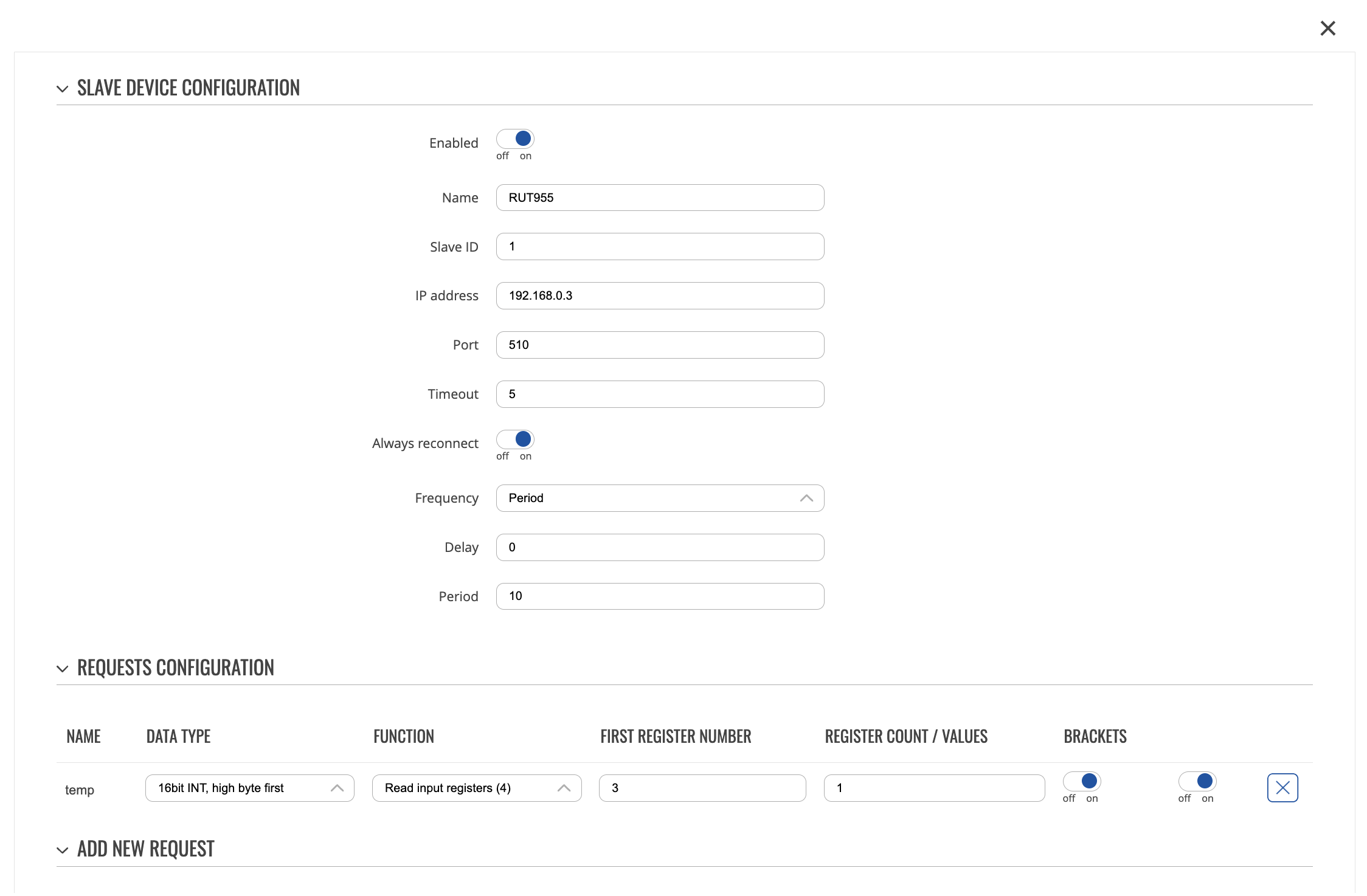 Also, we have to add Modbus slave device configuration. To do this, follow the steps below: