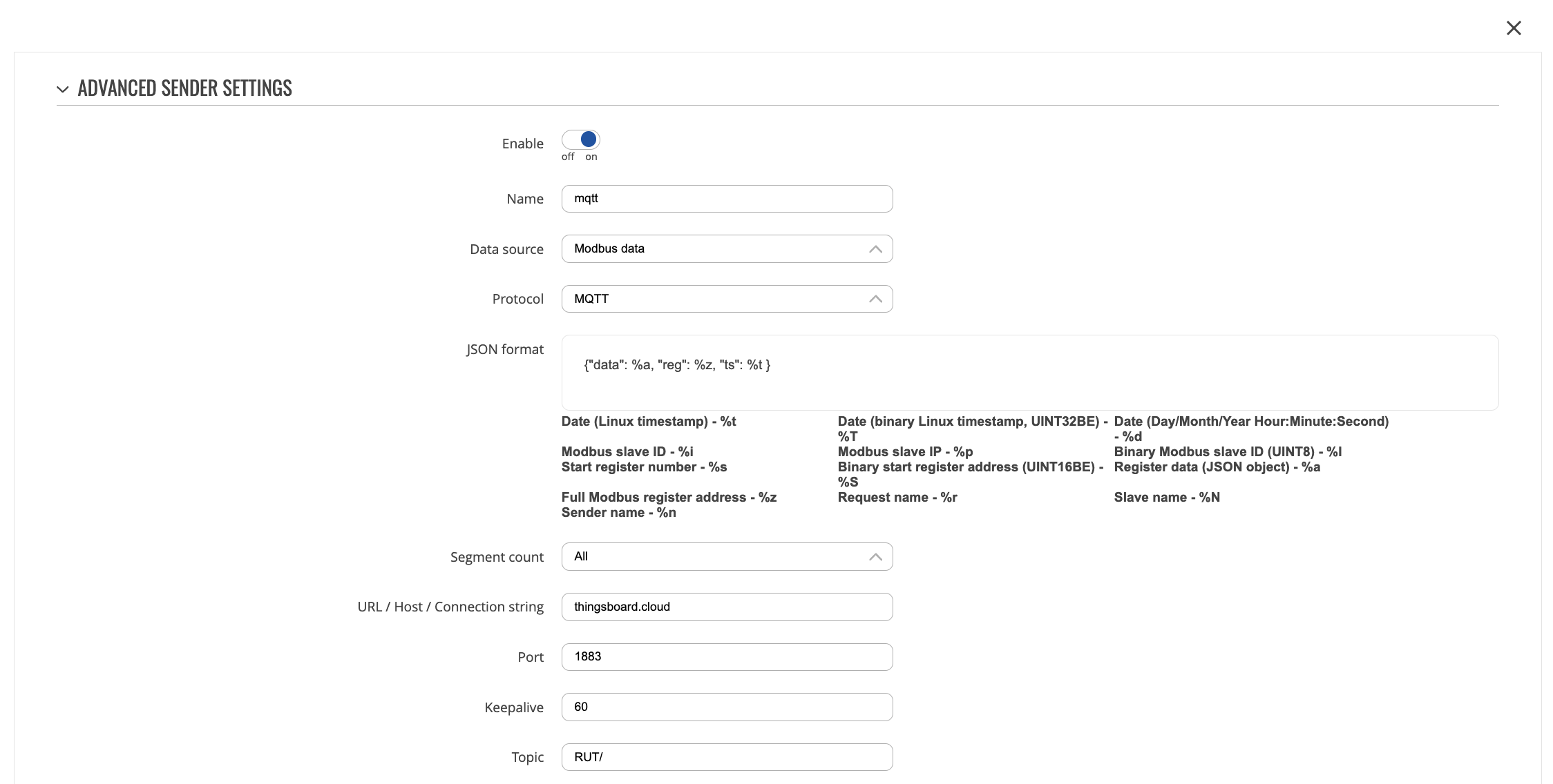 Click on “Transport configuration” tab. Select MQTT transport type and change Telemetry topic filter value from “v1/devices/me/telemetry” to “RUT/”. Click on “Add” button;