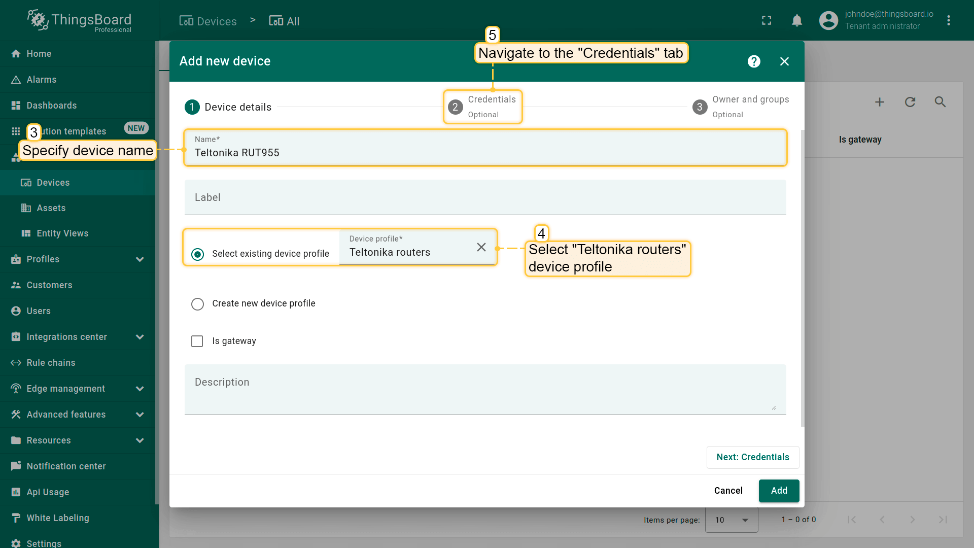 Input device name. For example, “Teltonika RUT955”. Select created device profile from the step above, in our case “Teltonika routers”;