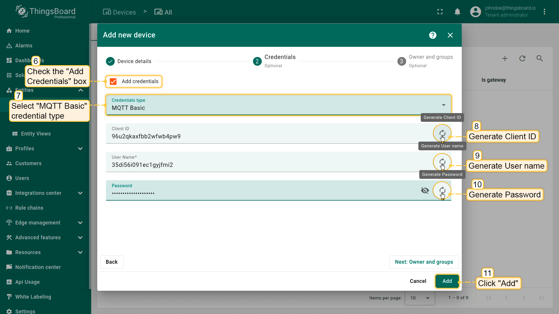 Click on “Credentials” tab. Check “Add credentials” and select “MQTT Basic” credentials type. Click on “Generate” button on each field and click “Add” button;