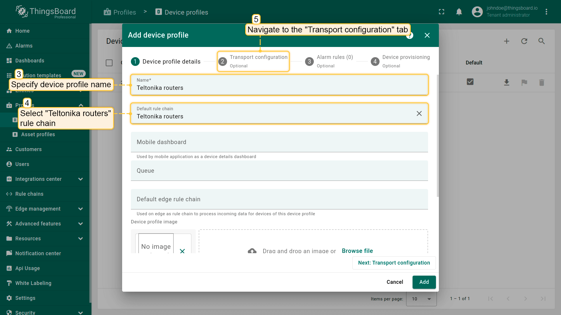 Click on “Transport configuration” tab. Select MQTT transport type and change Telemetry topic filter value from “v1/devices/me/telemetry” to “RUT/”. Click on “Add” button;