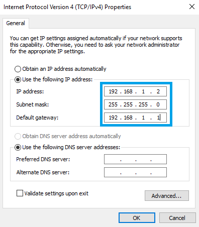 Your PC must be on the same network as the Gateway: 192.168.1.XXX. If that’s not the case, change the IP address of your PC. For Windows: