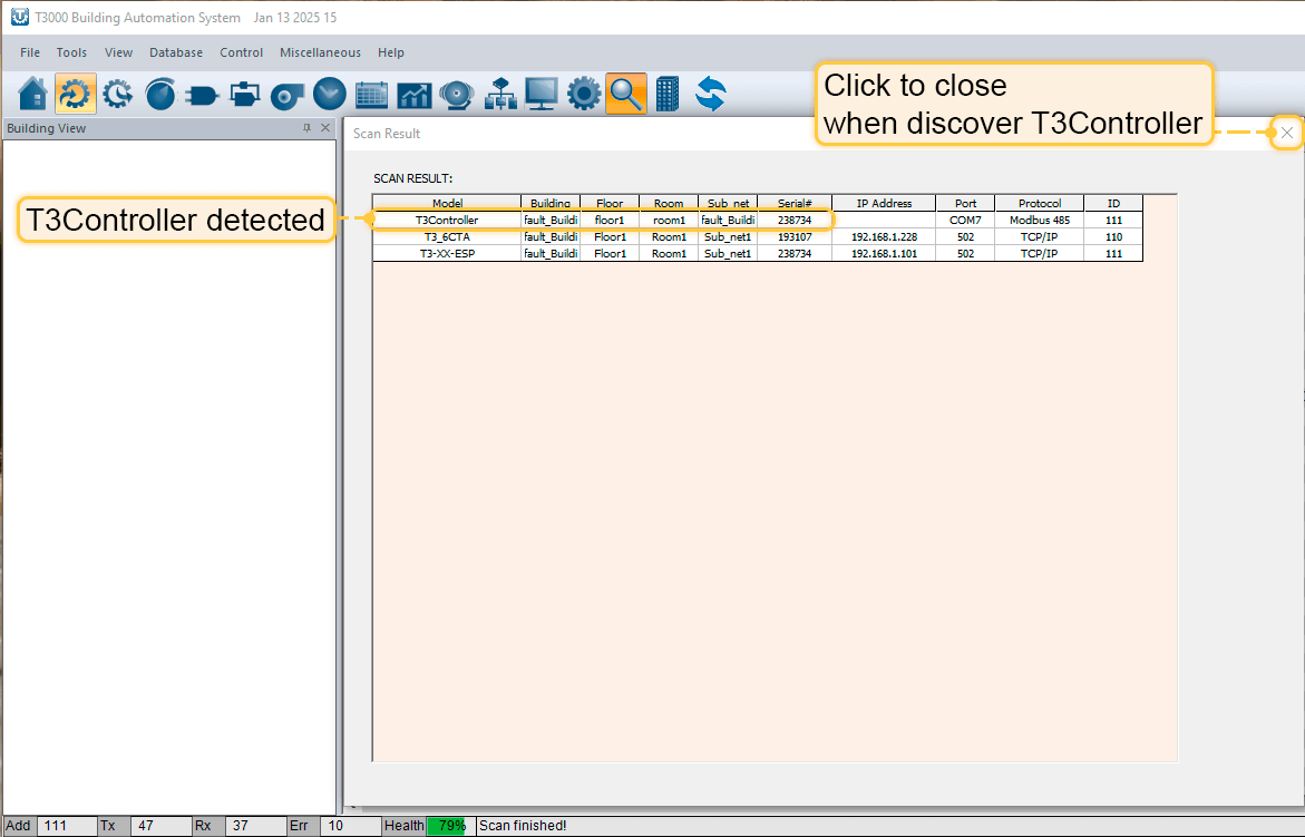 Connect Tstat10 to PC by RS485 and start T3000 software. Click the button “Search” to scan your network, the following view will appear;