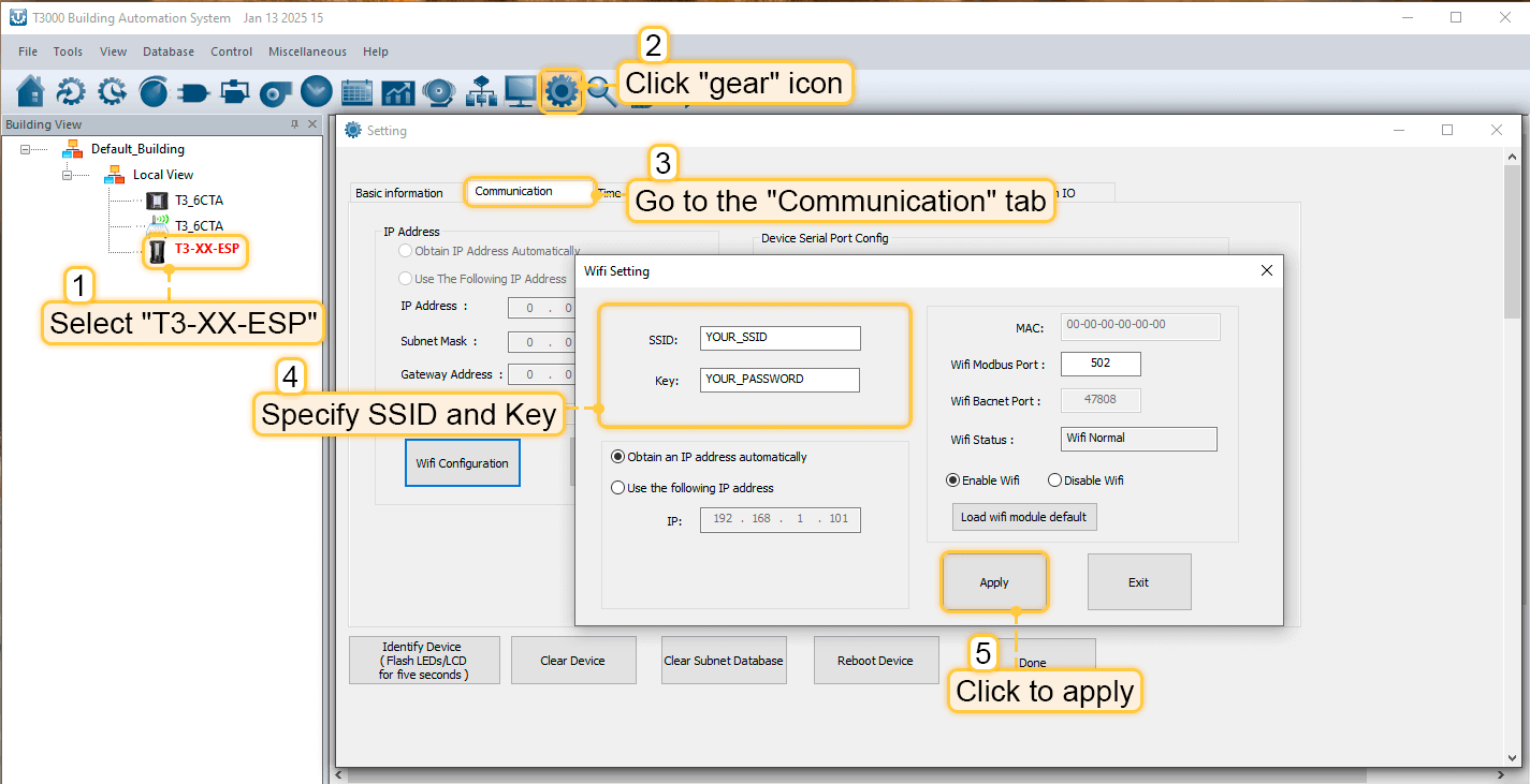 Click on “Tstat10” device in the sidebar, in the opened window select “TCP/IP” tab and click on the “Wifi Configuration” button. In the opened window, provide your Wi-Fi network credentials and click “Apply”.