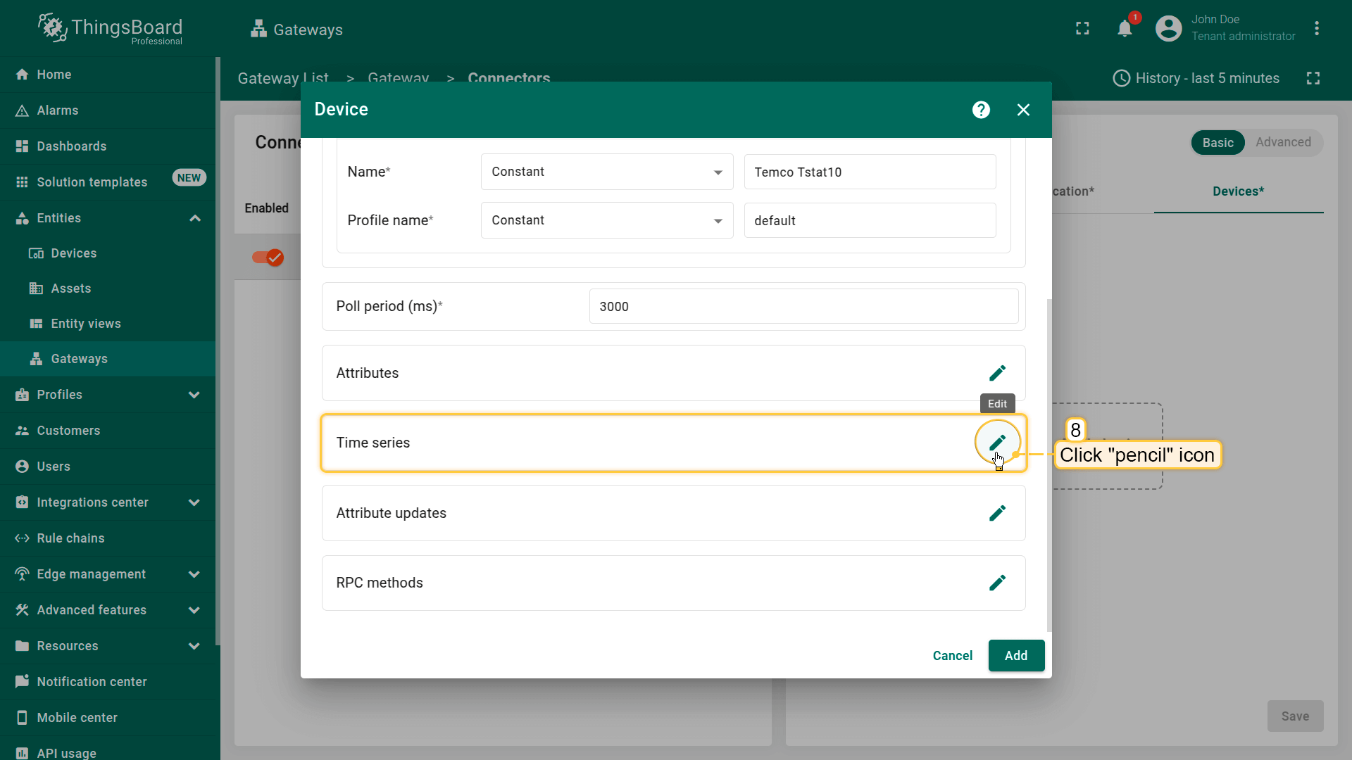 Start by clicking the “pencil” icon, selecting entity aliases, choosing the “My device” alias and then clicking the “pencil” icon again to open it for editing.