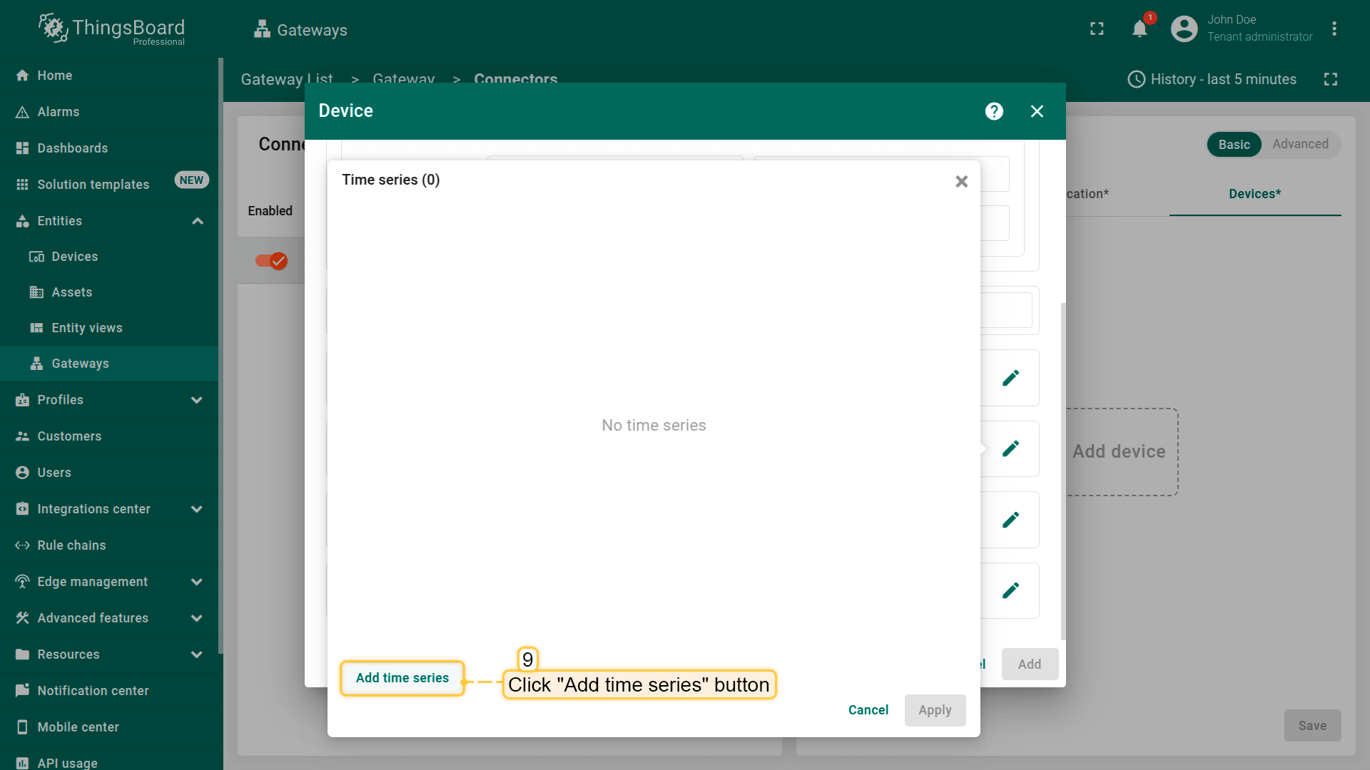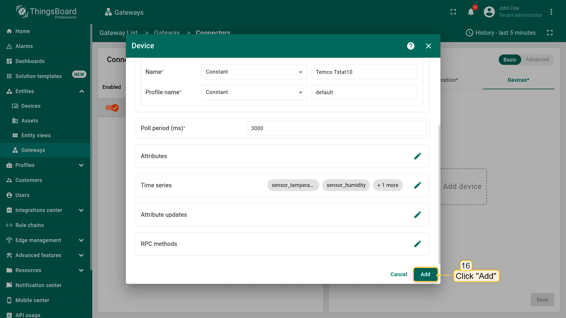 Open the IoT Hub in your browser and log in. Go to “Entities” > “Gateways” tab in the sidebar and click on “+” button. Fill in “Name” and “Device profile” fields and click “Create” button;