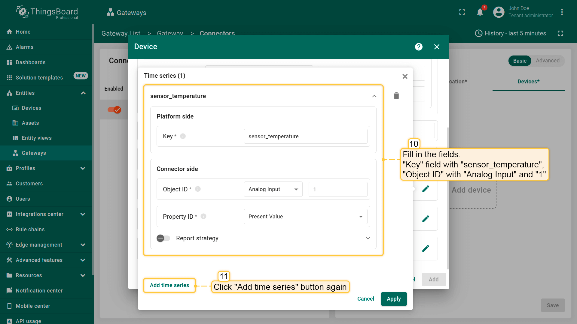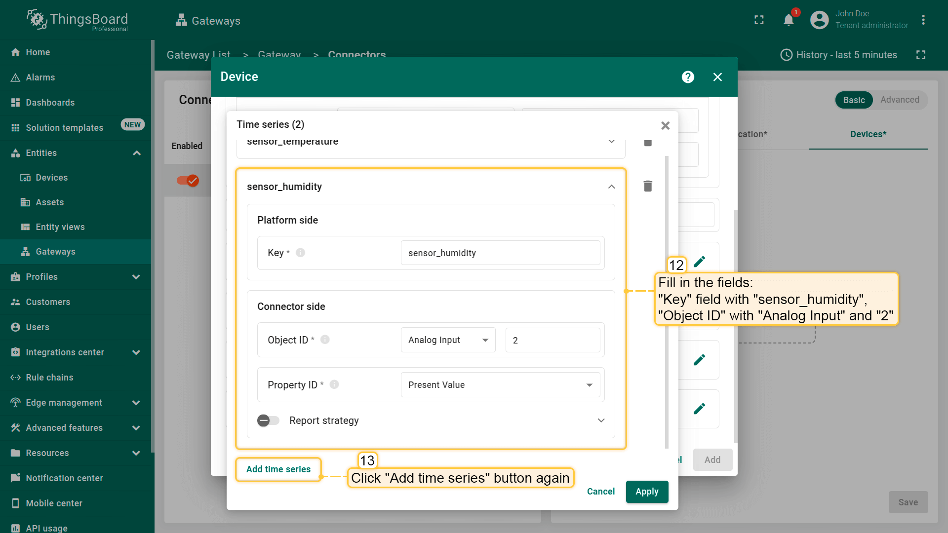 Fill in the “Key” field with “sensor_temperature”, “Object ID” with “Analog Input” and “1”. Click “Add time series” button;
