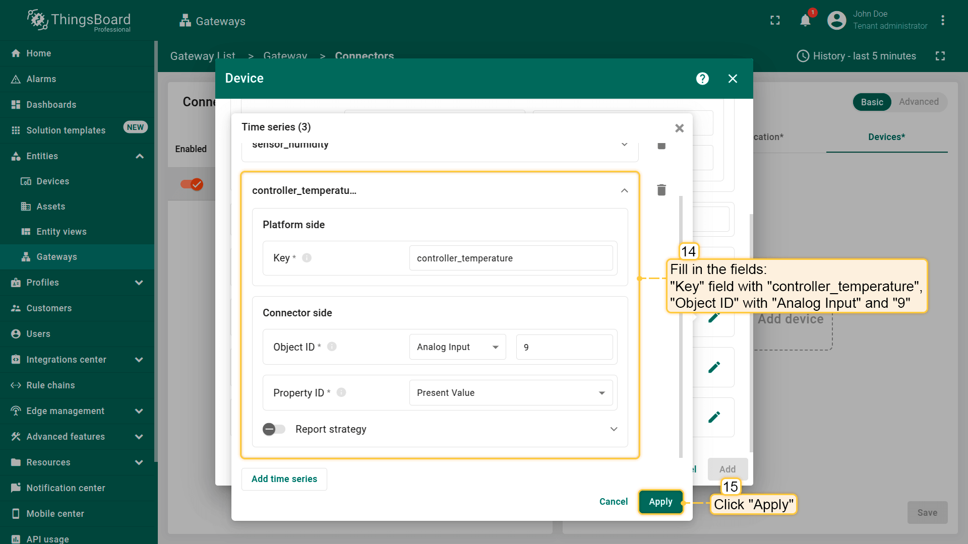 Fill in the “Key” field with “controller_temperature”, “Object ID” with “Analog Input” and “9”. Click “Apply” button;