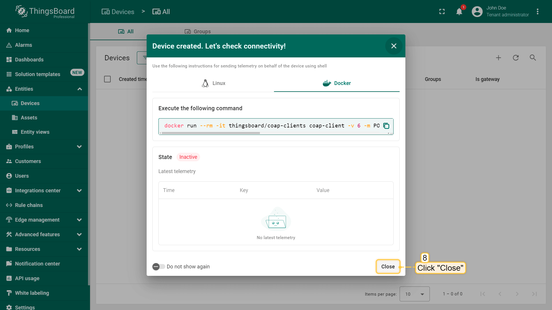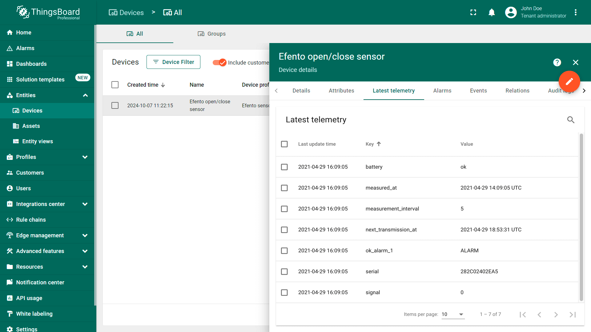 Click on the device and the most recent data from the device will be visible in the “Latest telemetry” tab.